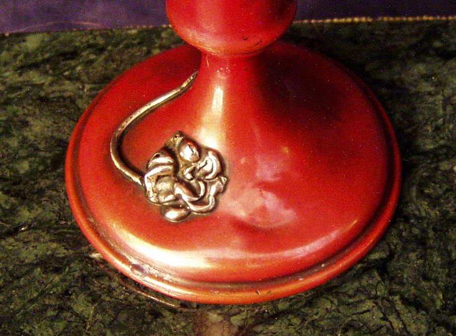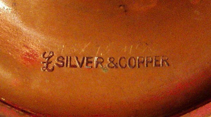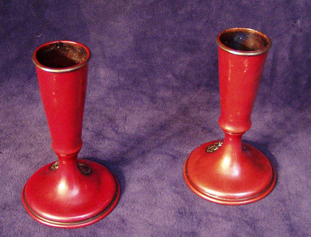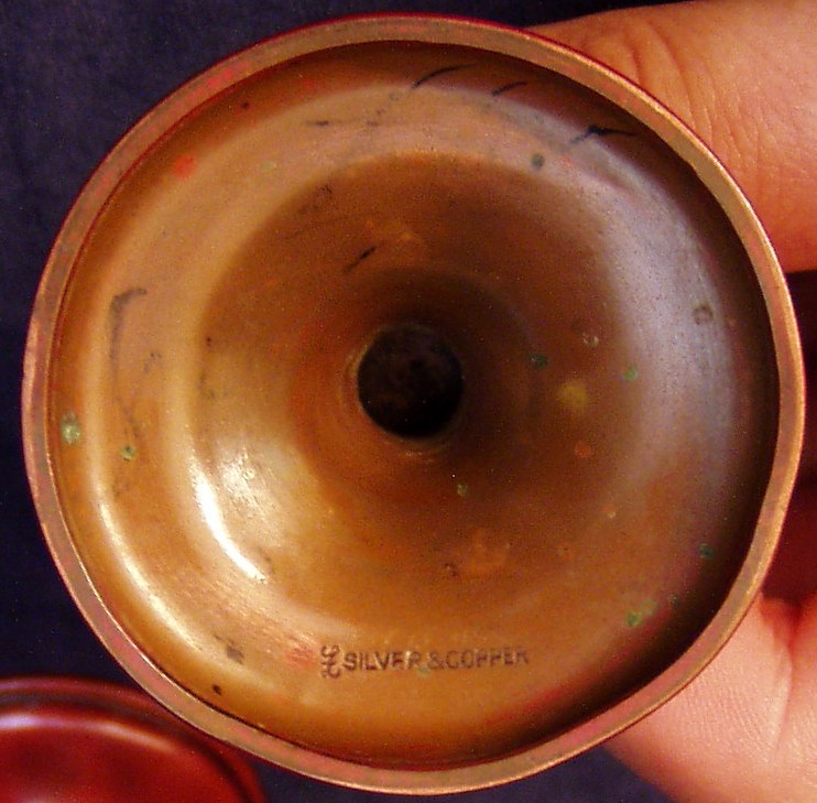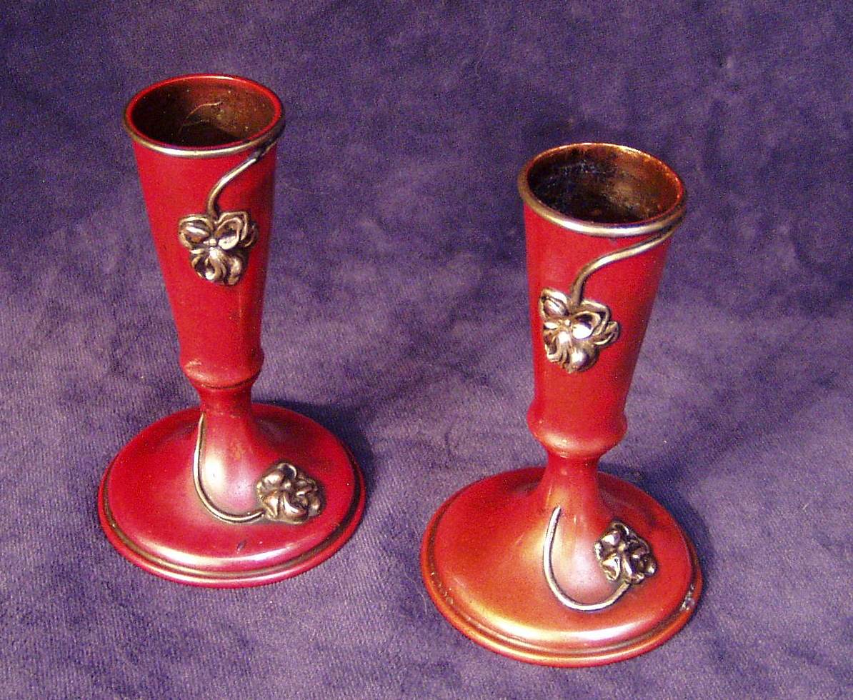 Pr Sterling and copper bud vases by La Pierre & Co cr 1895 w/subtle Art Nouveau leaf stems.