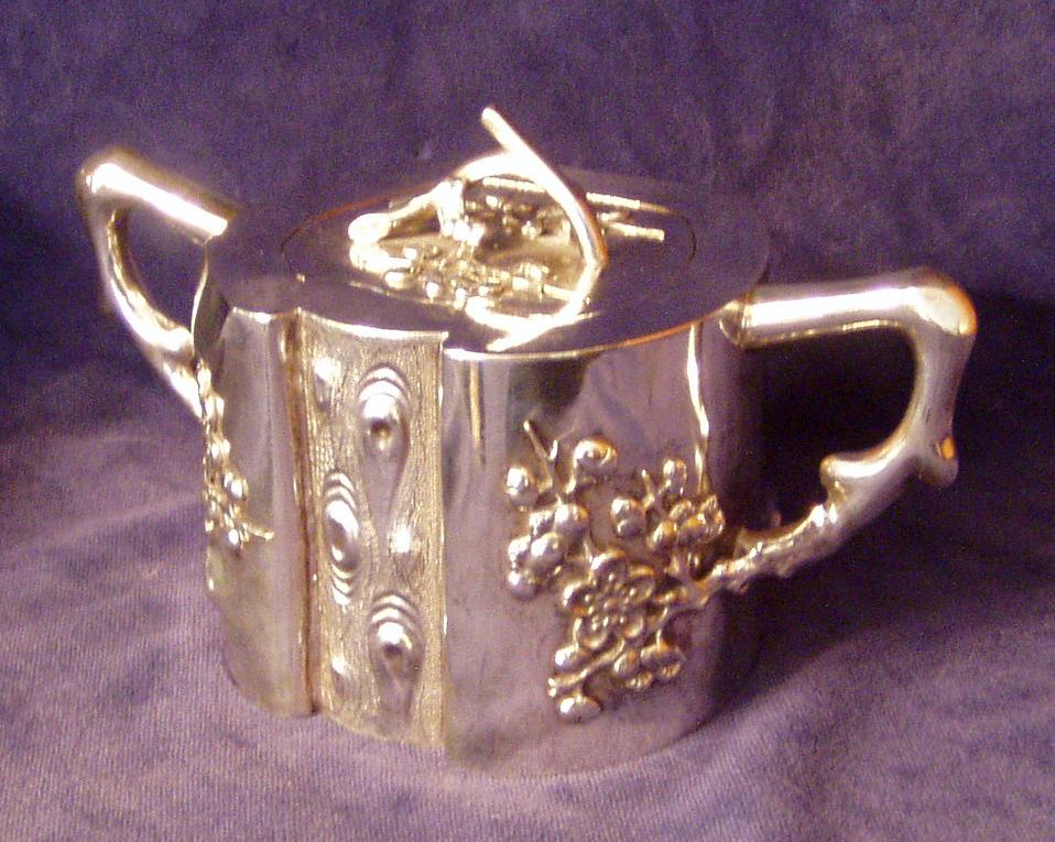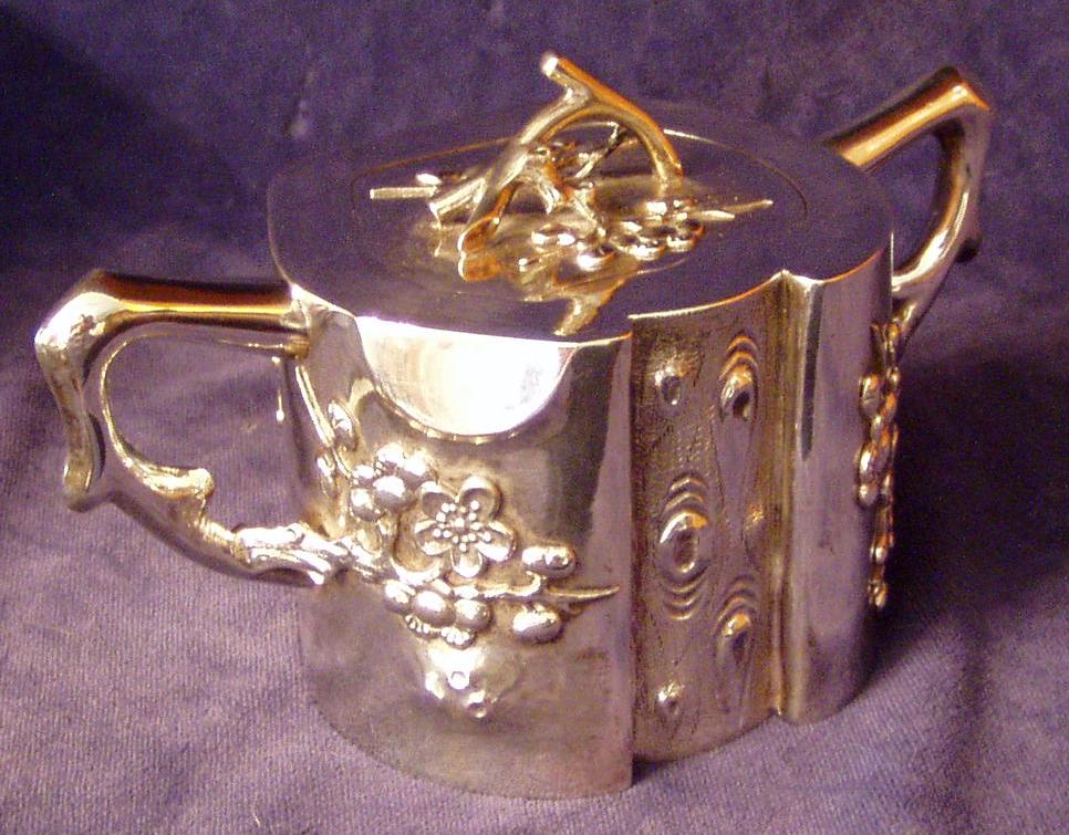 Cast and applied Prunus decoration, twig finial & fitted, hinged lid. Hollow Handle.