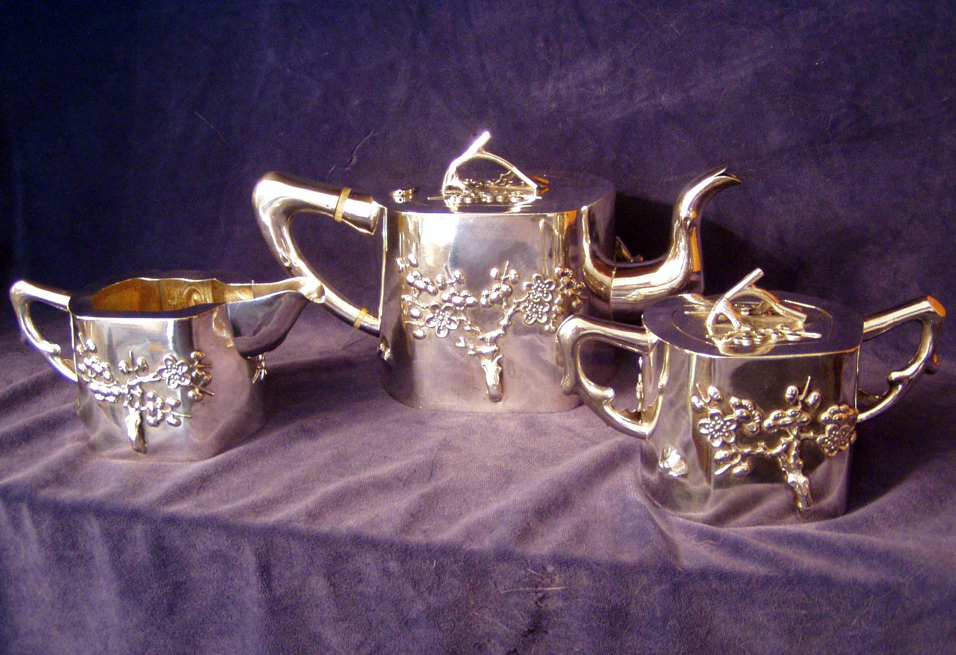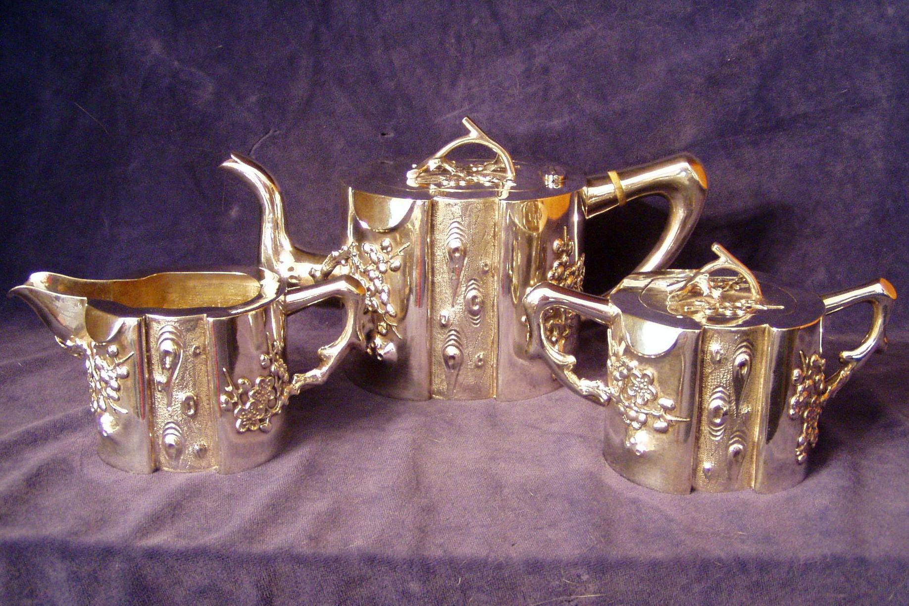 Three piece Chinese Export Silver Tea Set with Bamboo Culme motif.