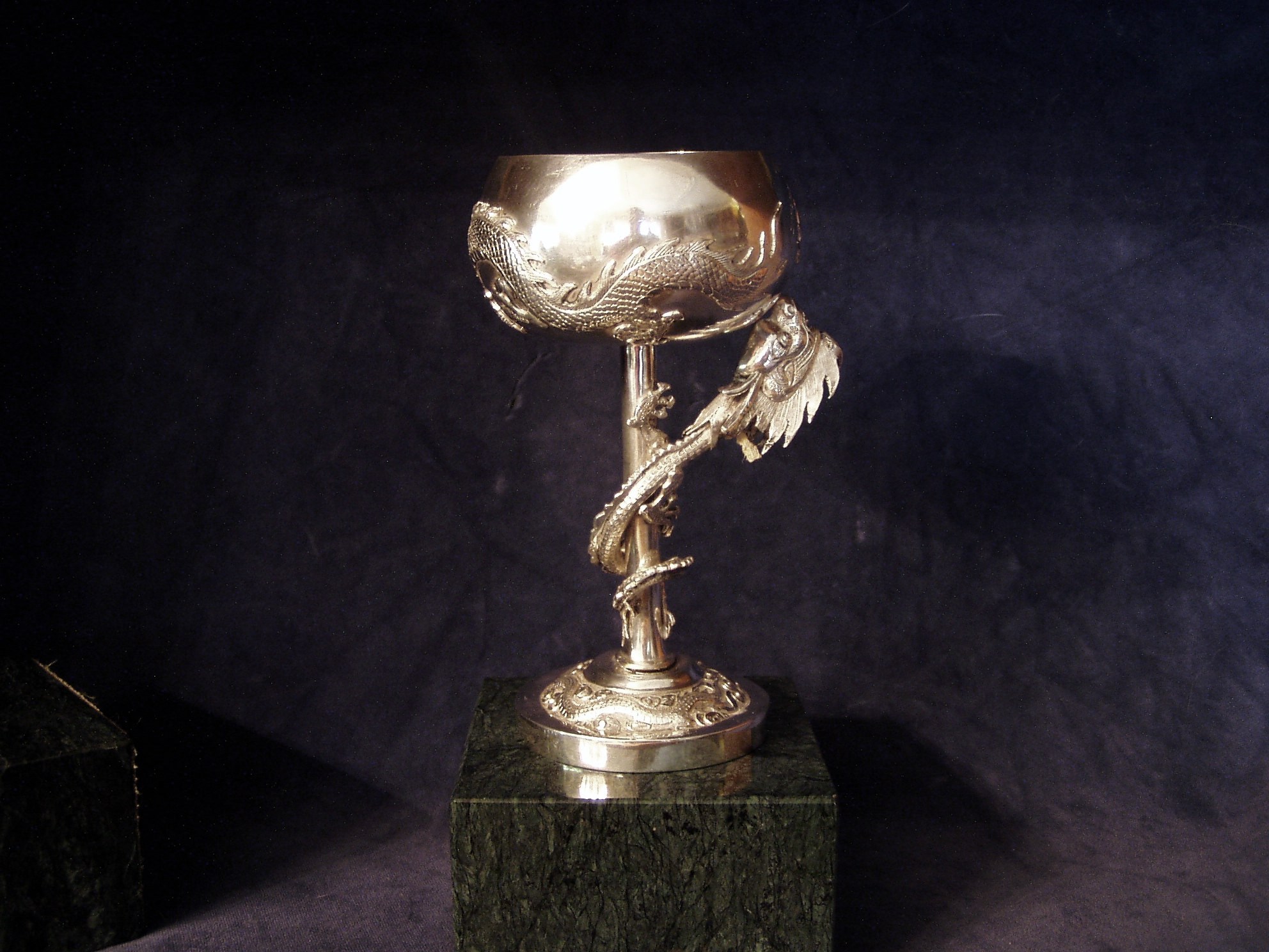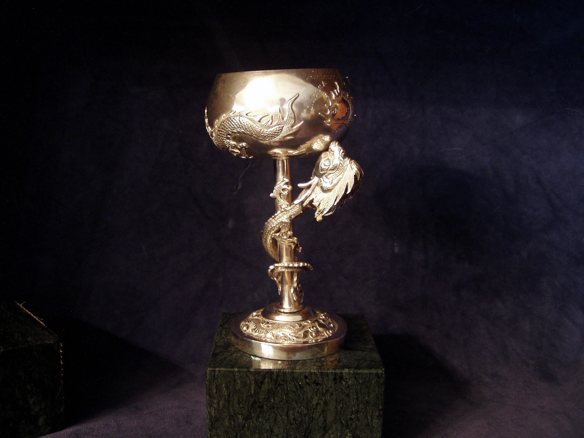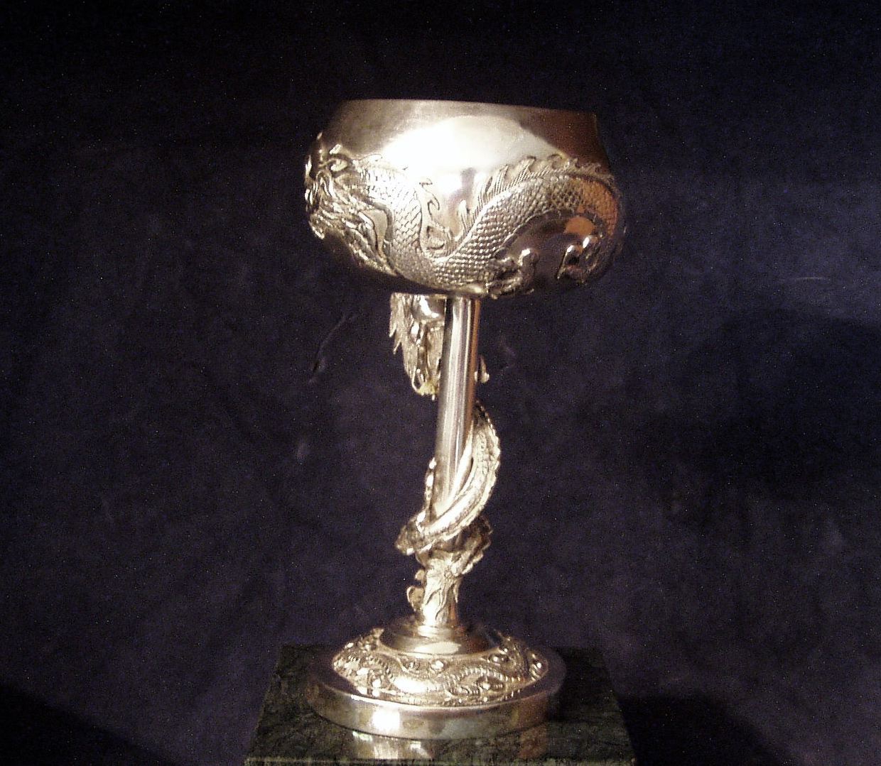 Chinese Export Silver trophy as Brandy Snifter atop a dragon entwined stem. Engraved