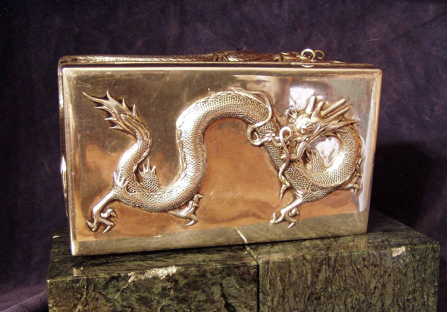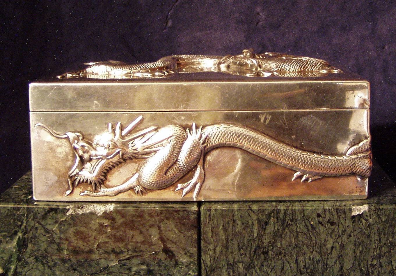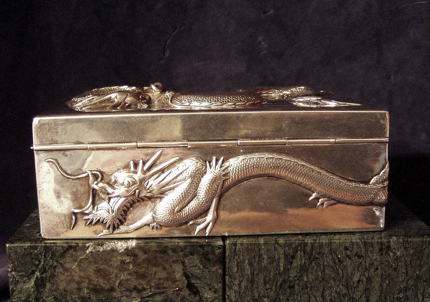 Chinese Expert Silver Cigarette Box decorated w/chased three toe’d dragons and applied
