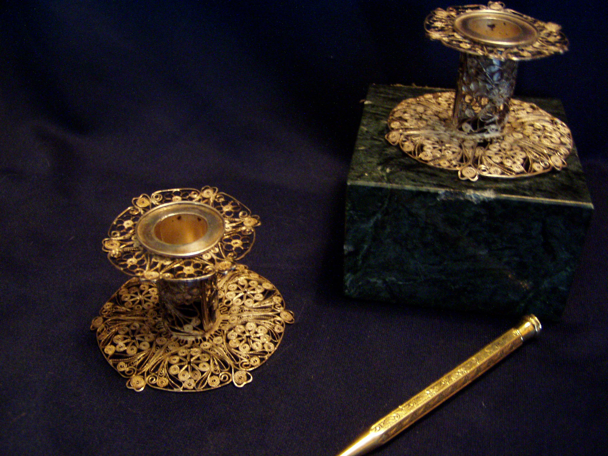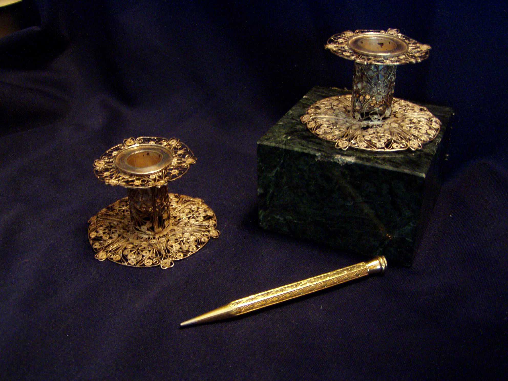 Pair of Chinese Export Silver filigree Candlesticks w/silver candleholder inserts marked