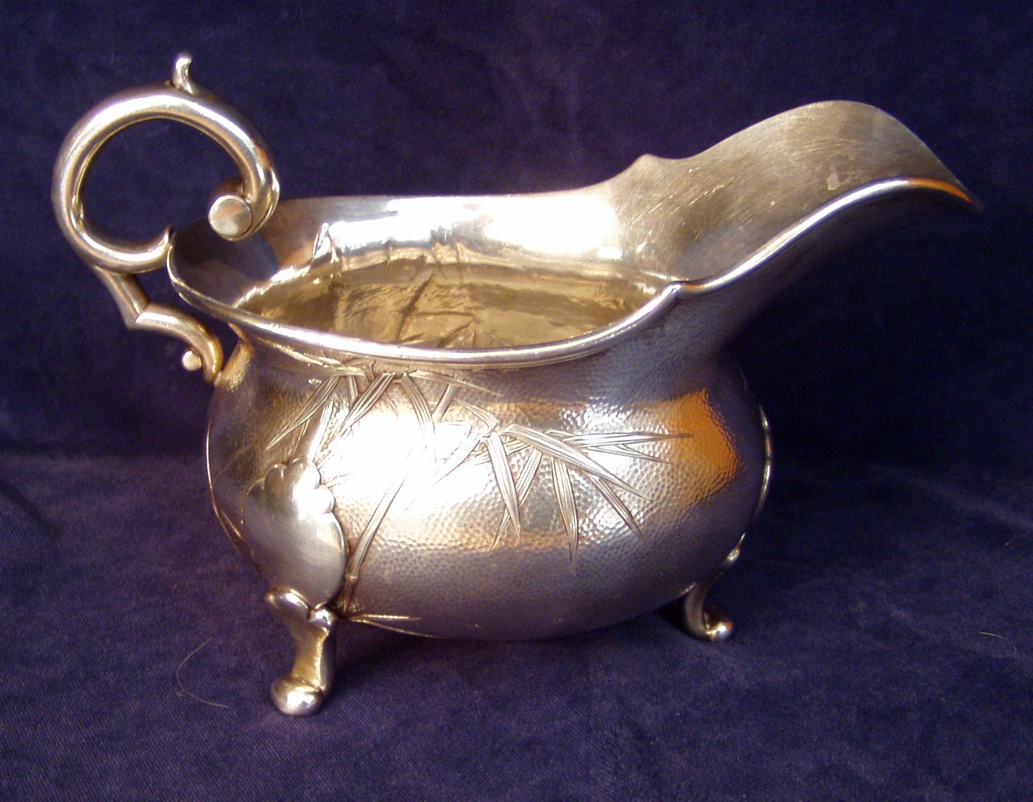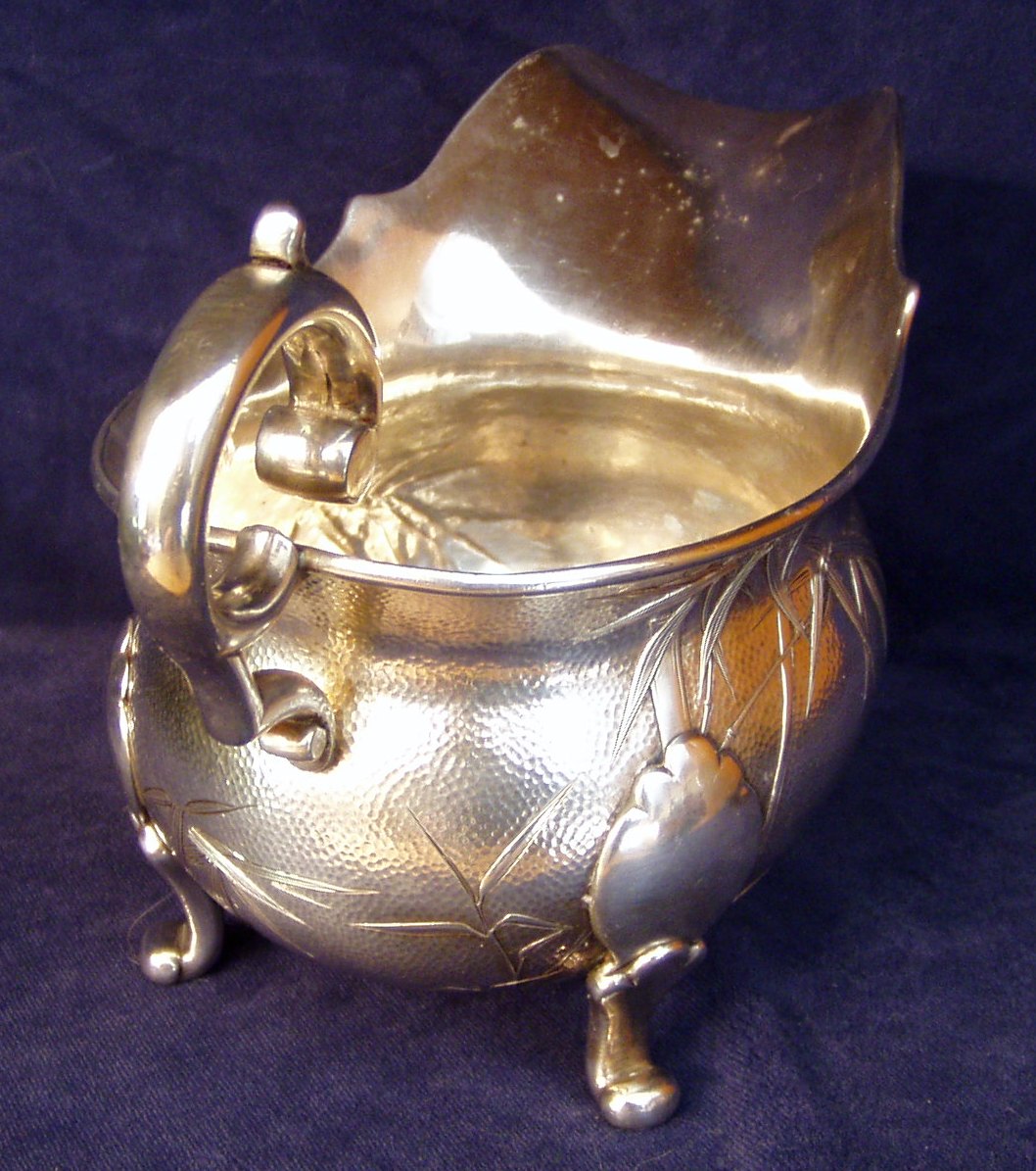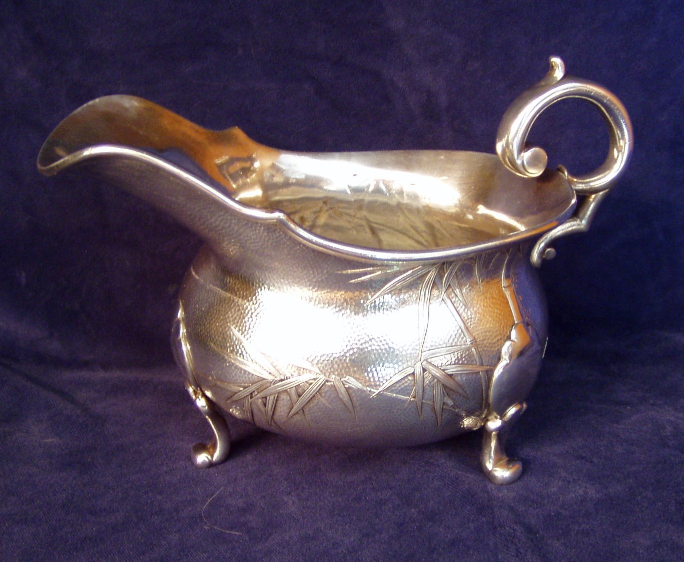 generous pouring lip; marked Sterling; Length 8” X Width 4” X 5 ¼” Height. Bamboo leaf