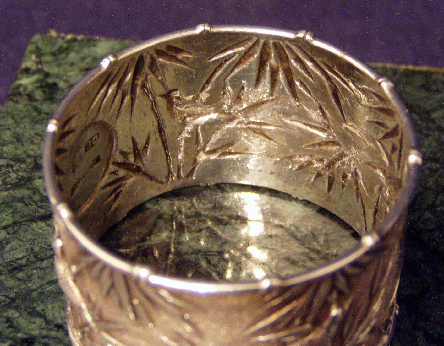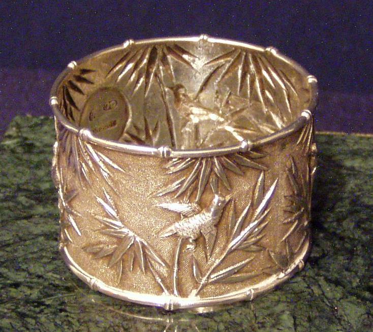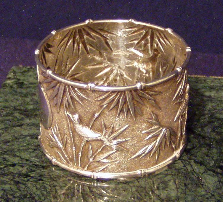 Chinese Export Silver 900F Napkin Ring w/chased decoration of Bamboo and birds & very fine