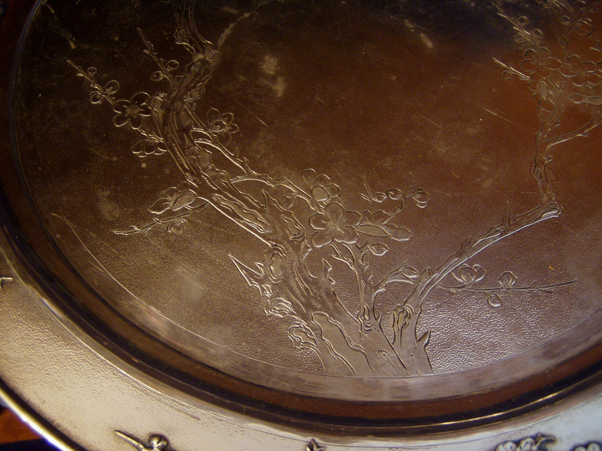 Round Chinese Export Silver, three button footed tray; prunus decoration w/noduled bamboo