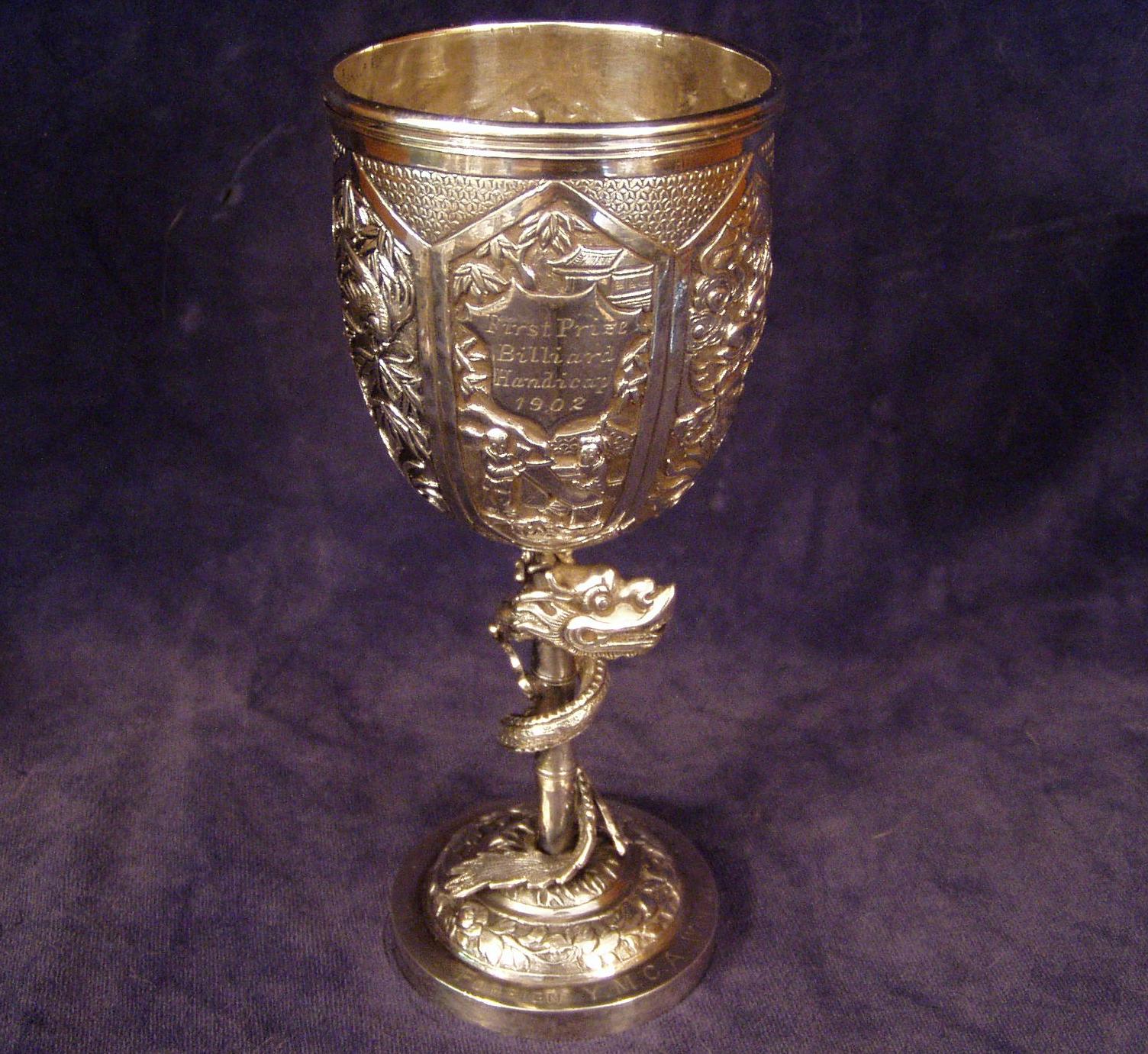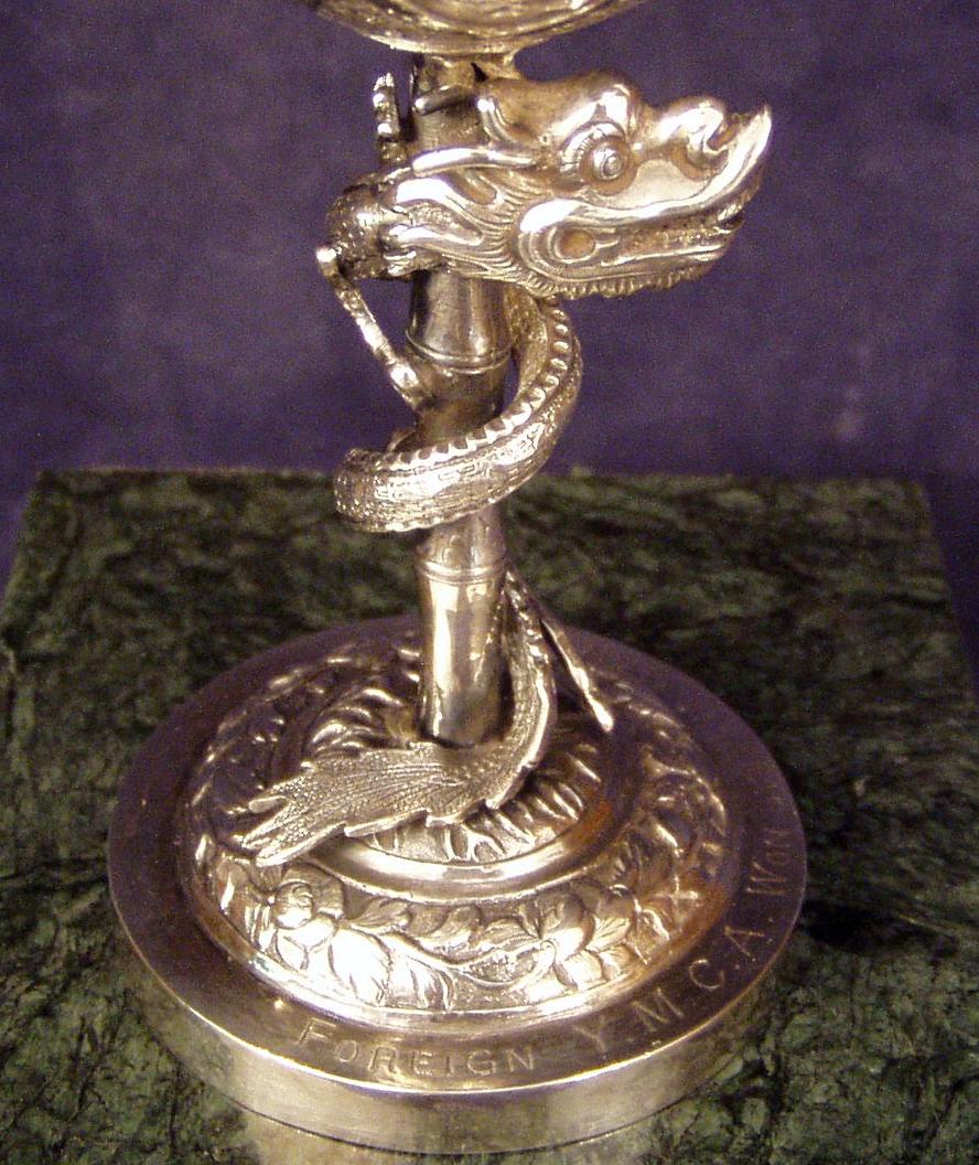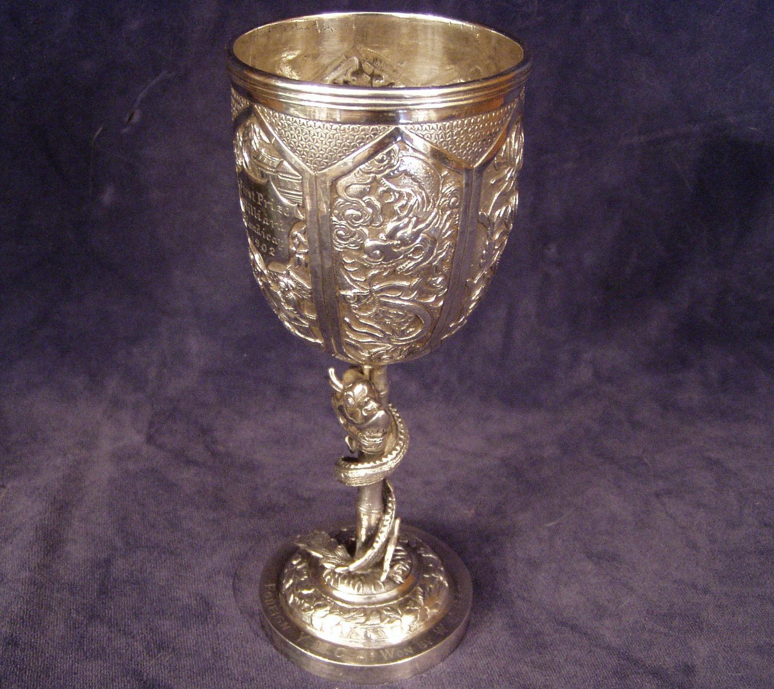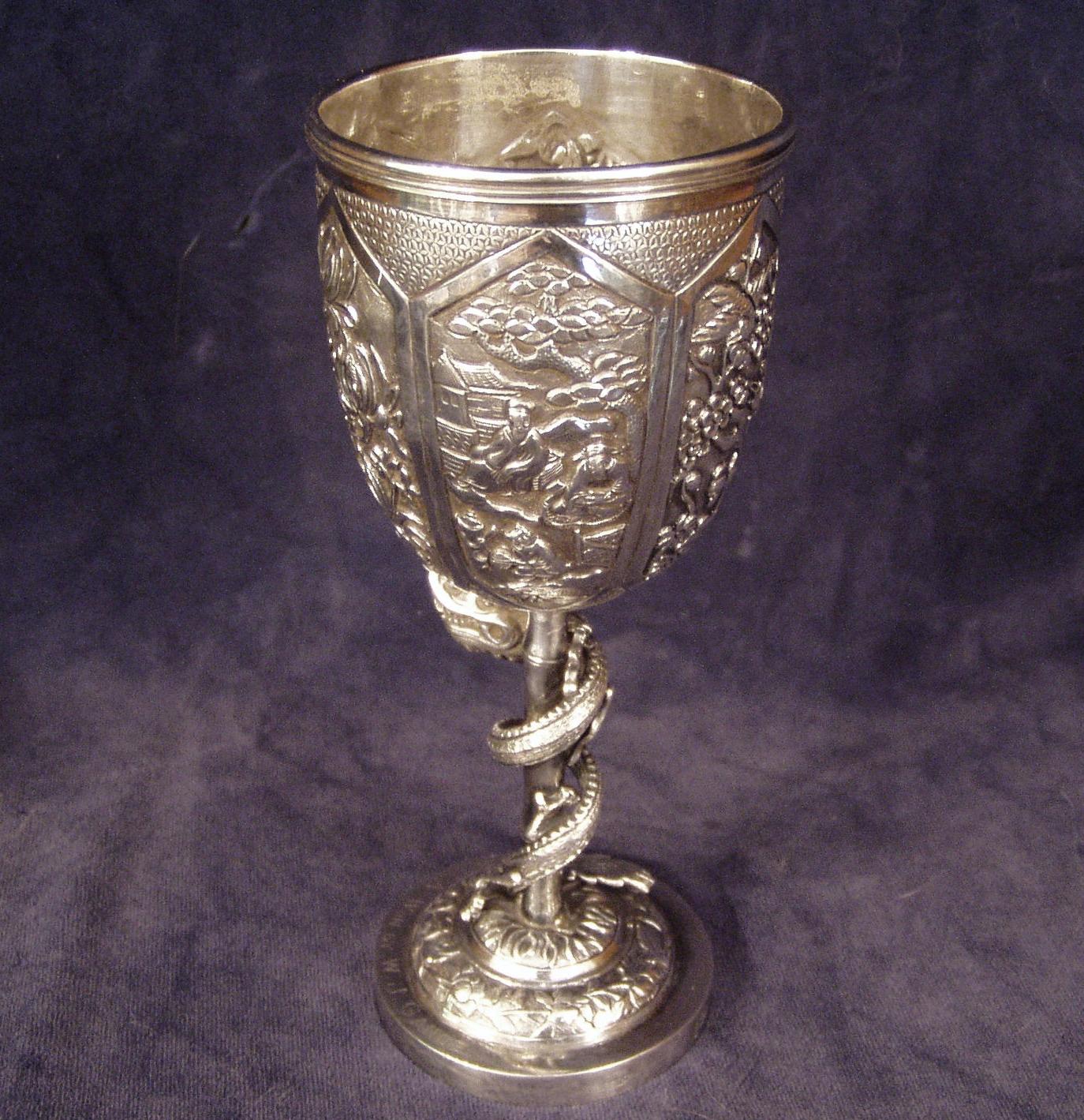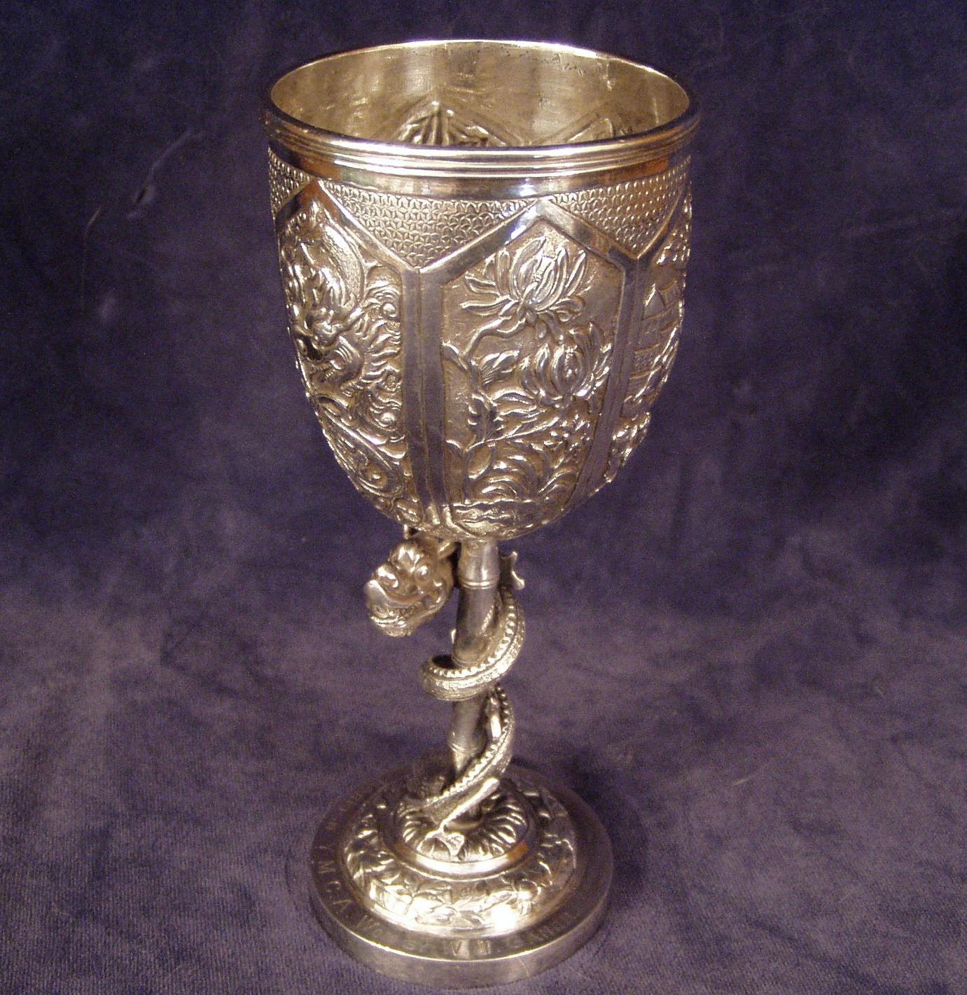 Chinese Export Silver Trophy cup w/ dragon entwined stem and 6 Persian influenced panels;