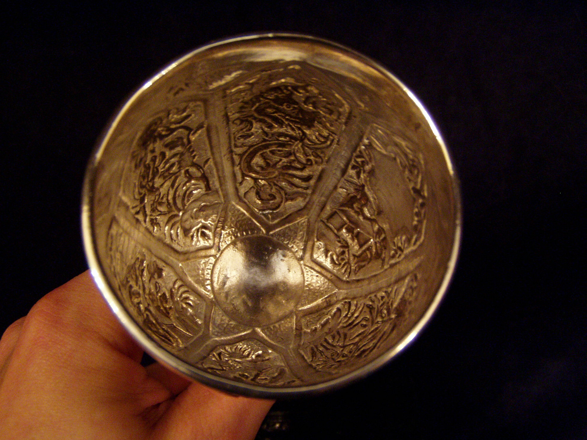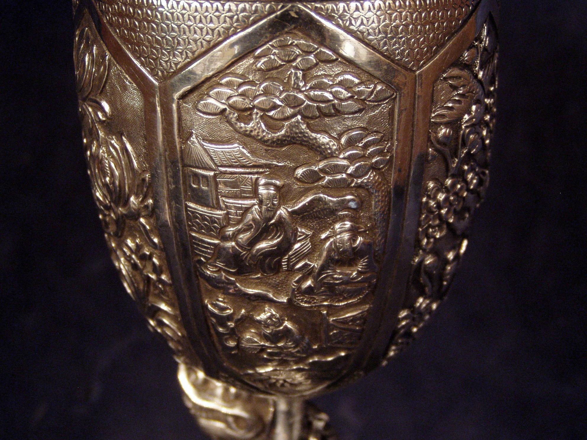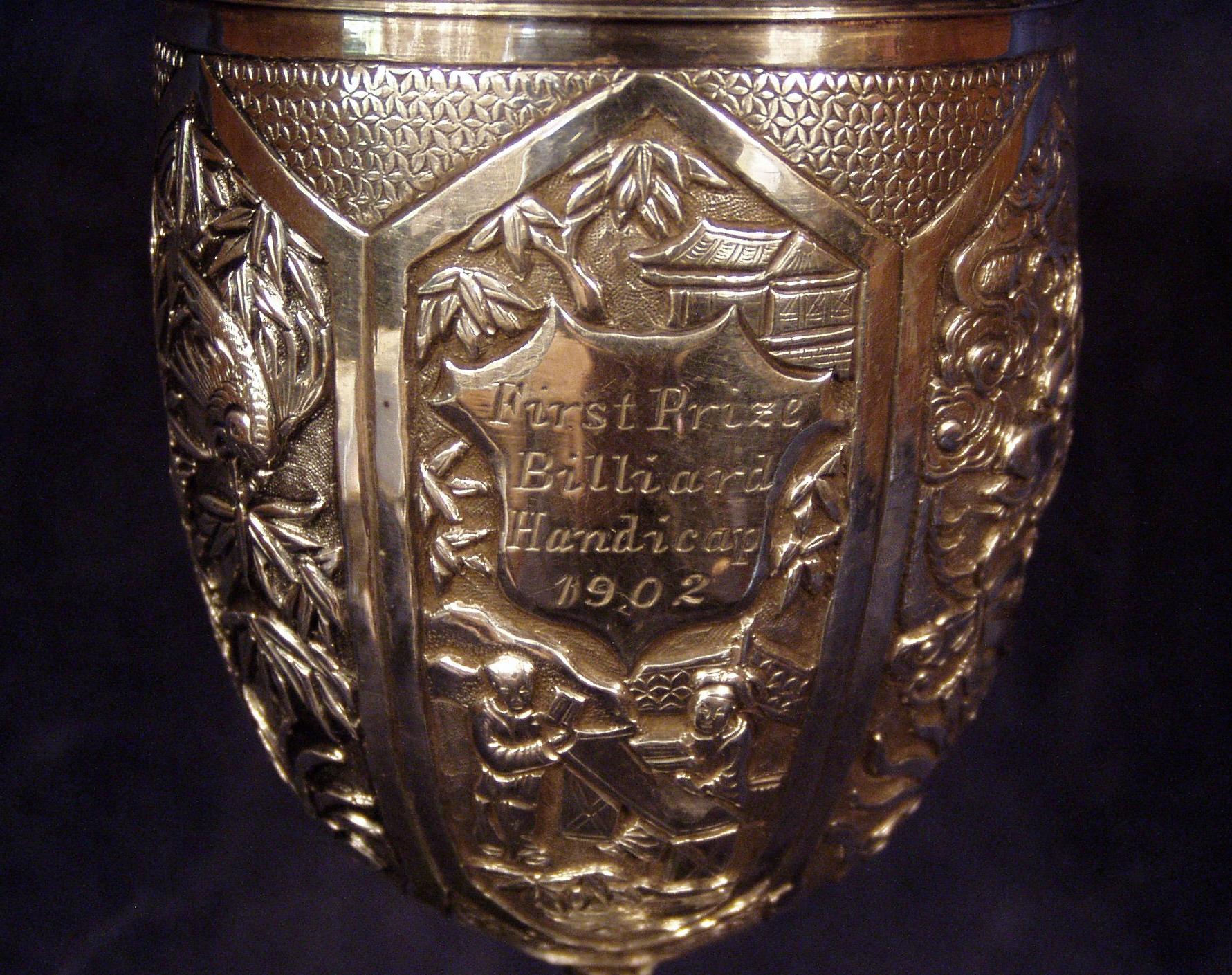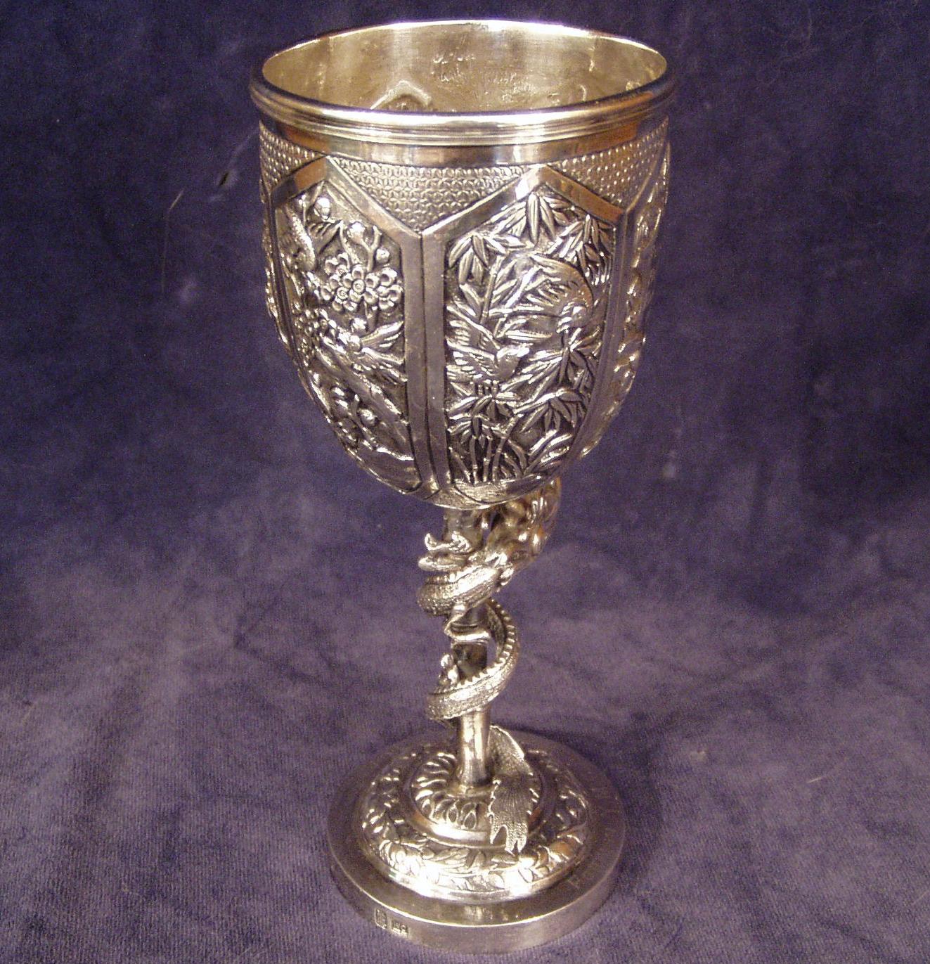 Chinese Export Silver Trophy cup w/ dragon entwined stem and 6 Persian influenced panels;