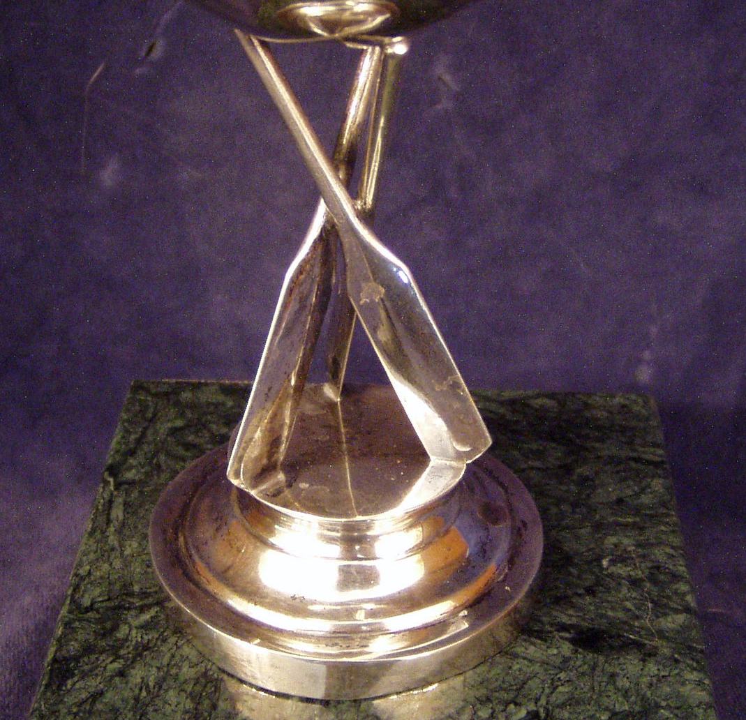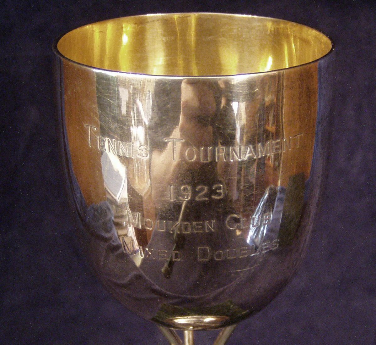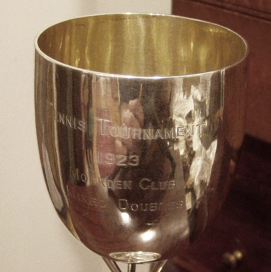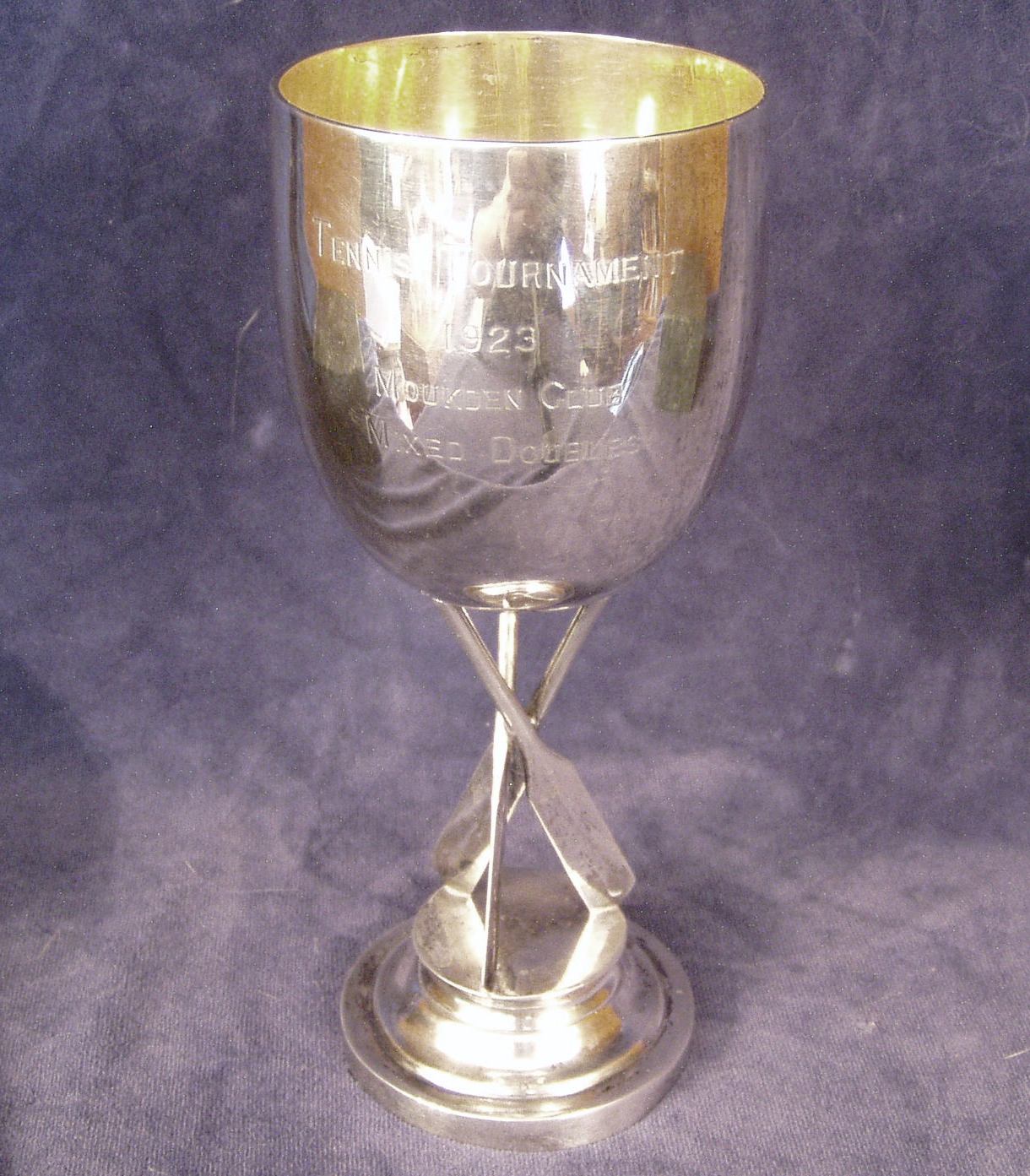 Chinese Export Silver Trophy Cup atop three crossed Cricket Bats. Inscribed Tennis