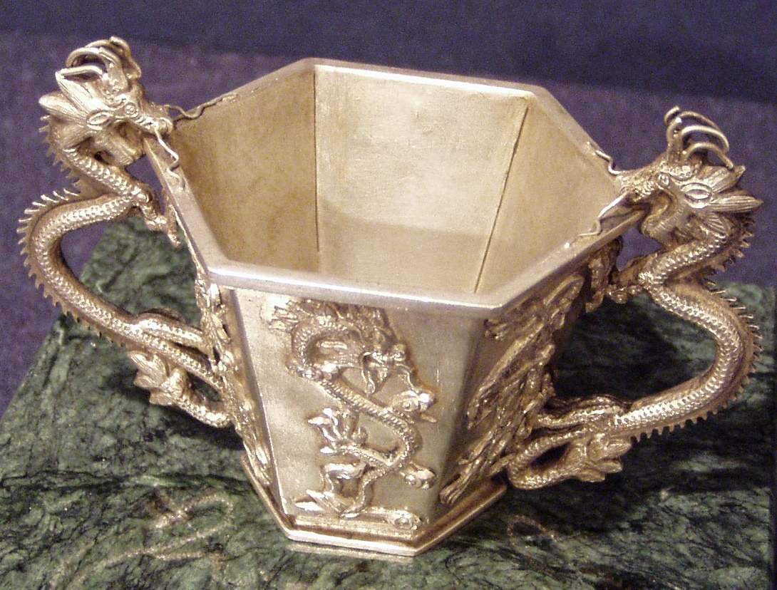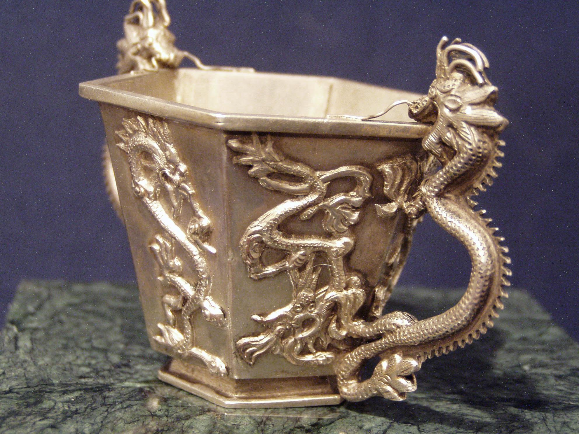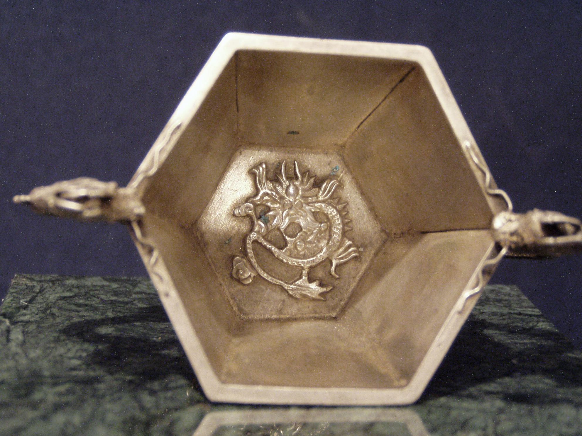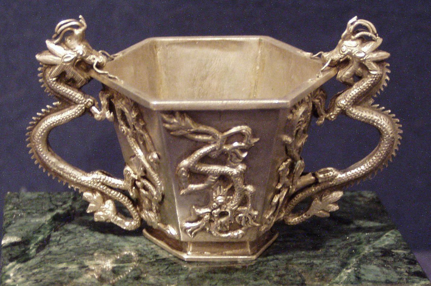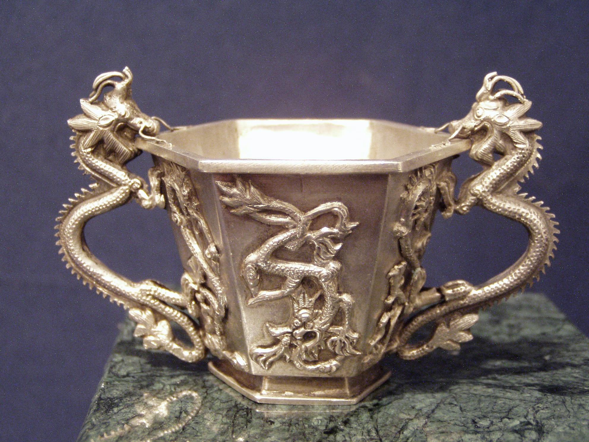 Chinese Silver Libation cup for internal consumption (not for export) w/two cast dragon handles