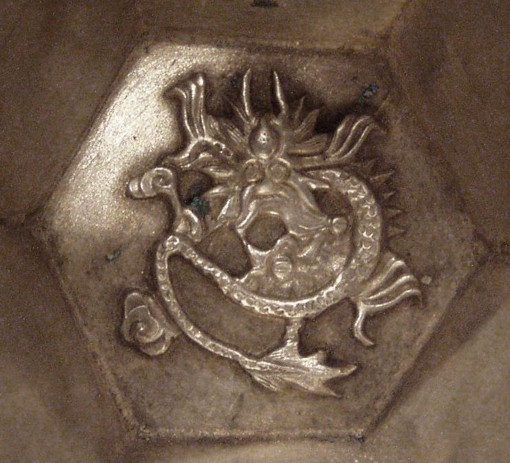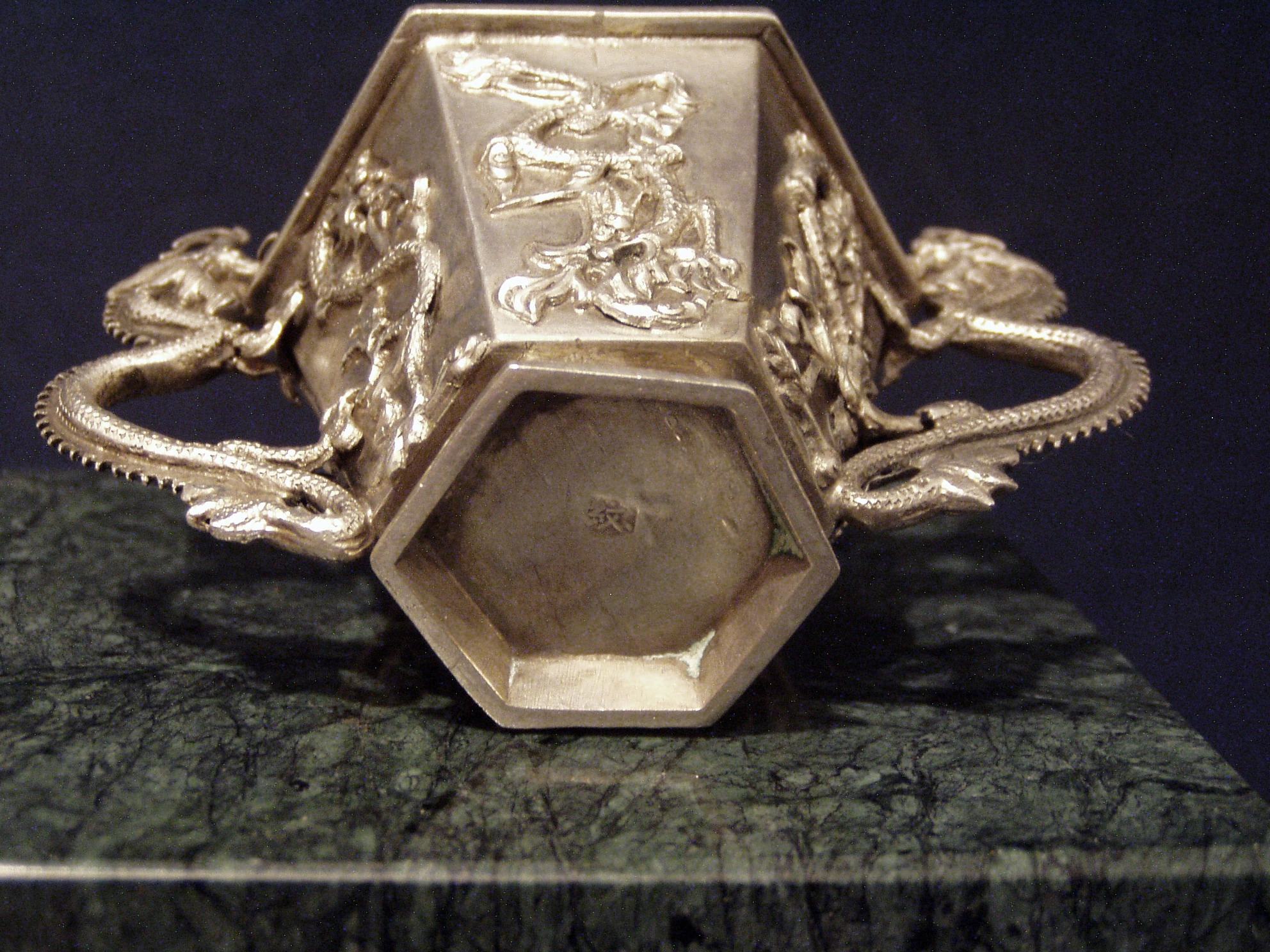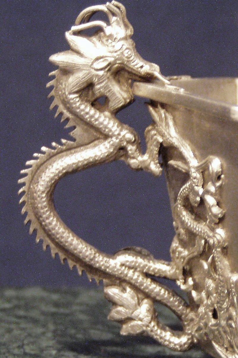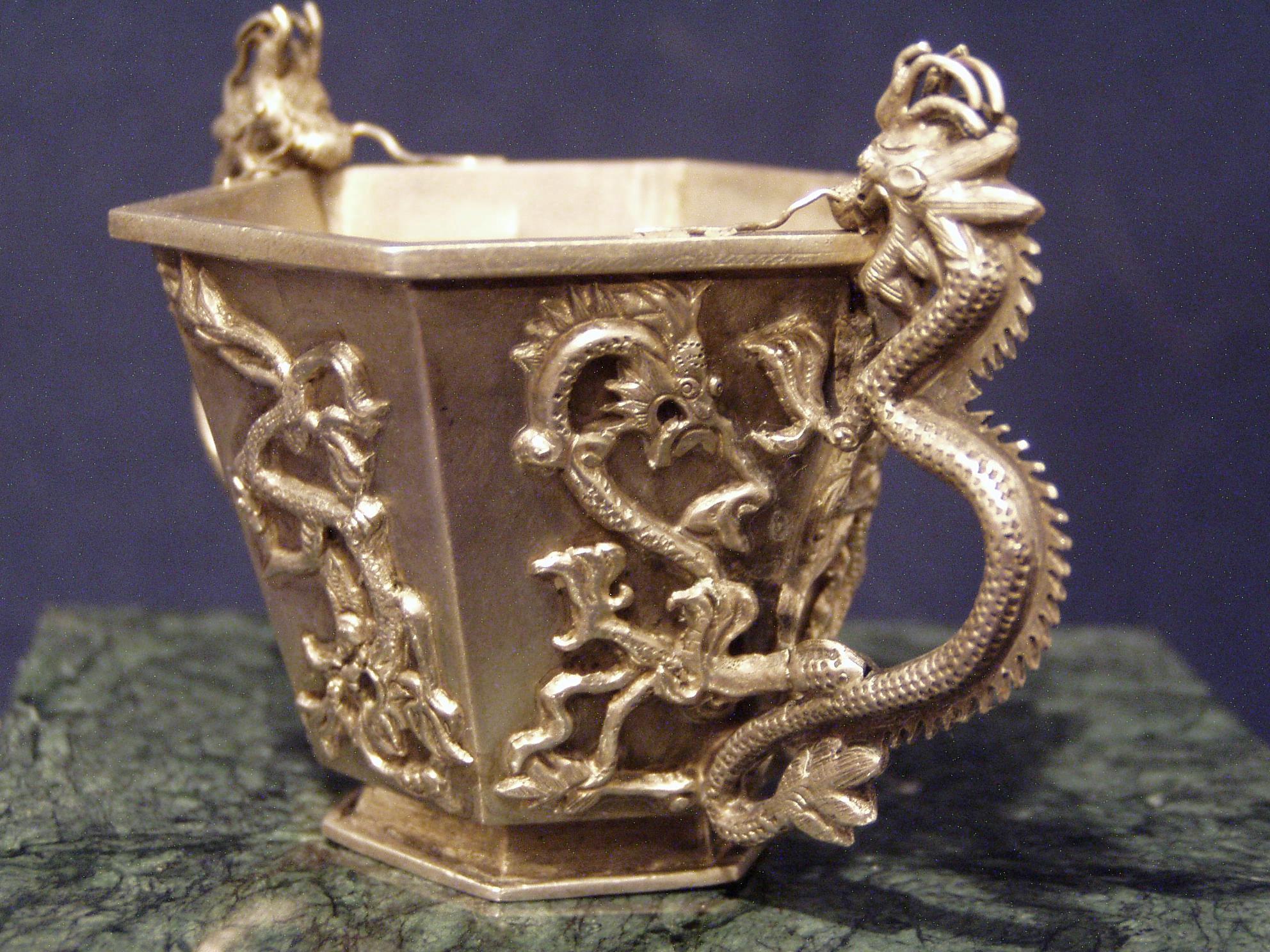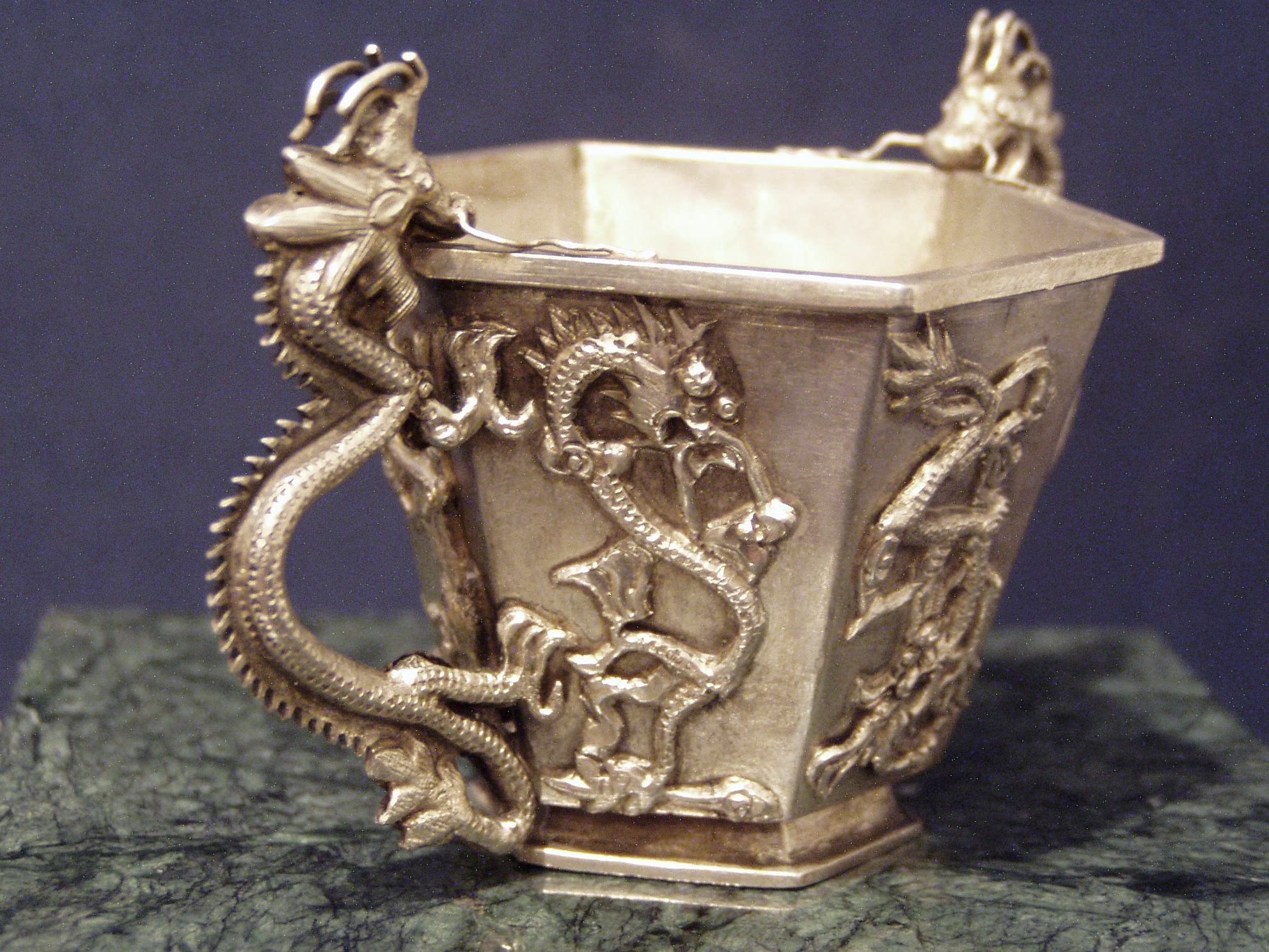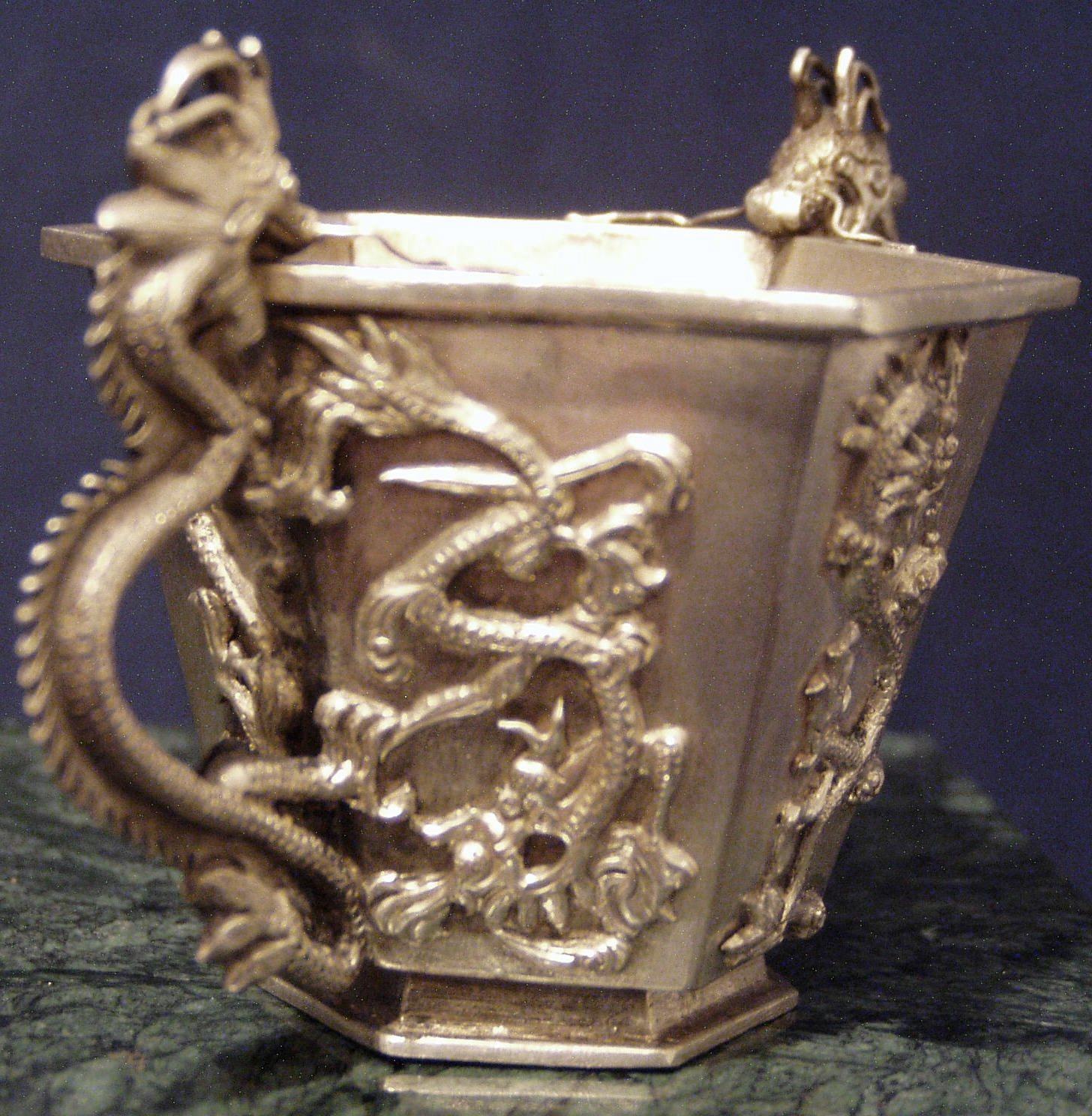 Chinese Silver Libation cup for internal consumption (not for export) w/two cast dragon handles