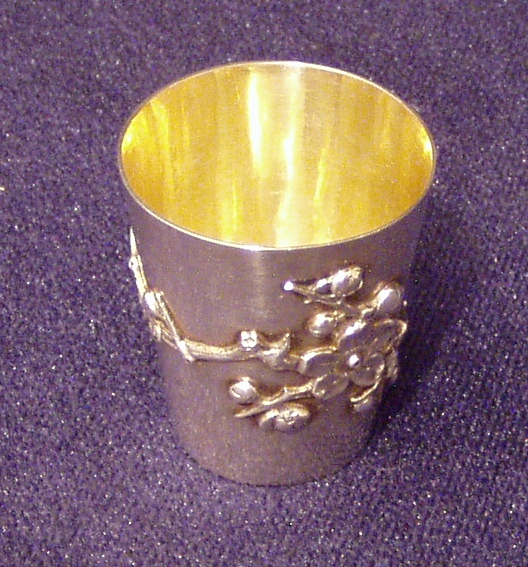 Chinese Export Silver 900F Jigger w/gilded interior and cast and applied prunus decoration on