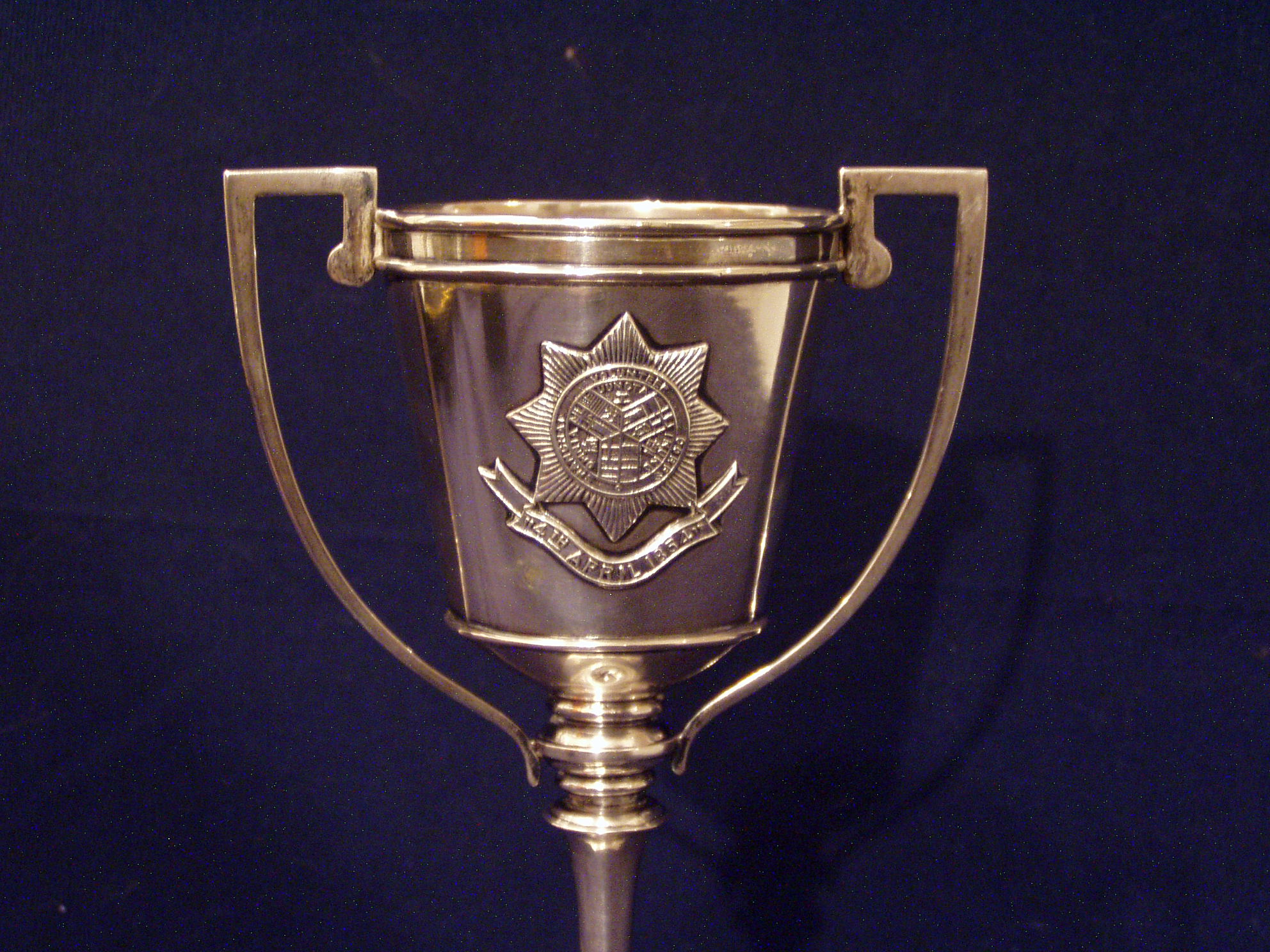 Silver the cast and applied Shanghai Volunteer Corp emblem. Height 6 ¼” (w/out stand) Width
