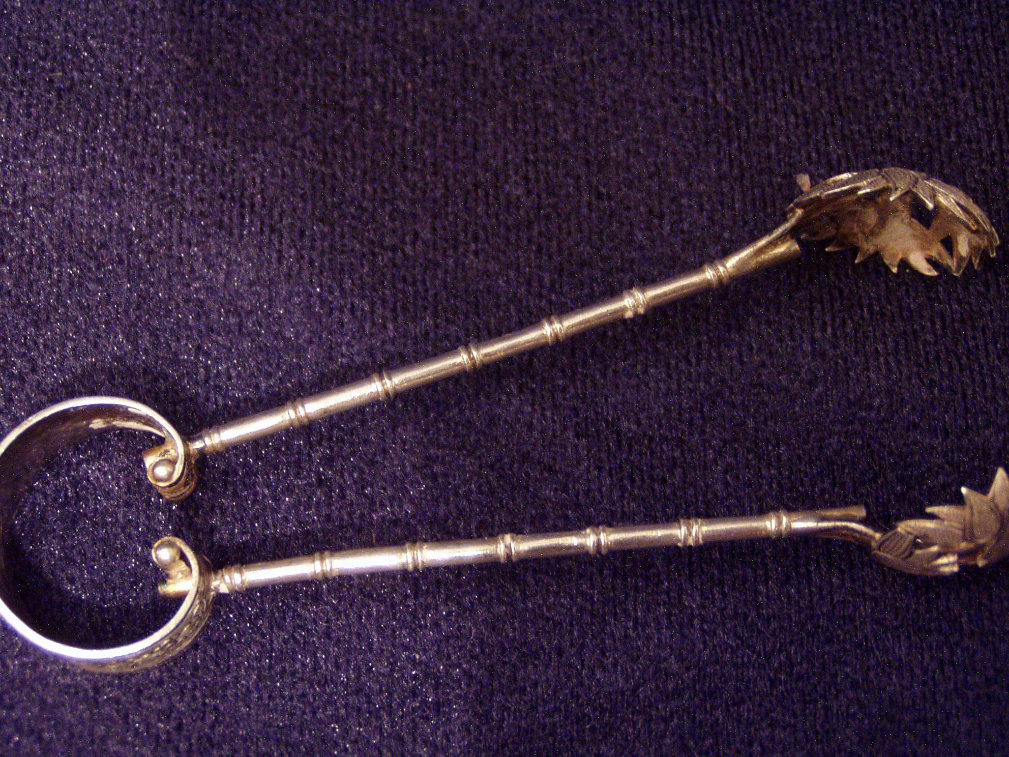 Pair Chinese Export Silver 900F Sugar Tongs w/bamboo culms as arms w/what appear to be