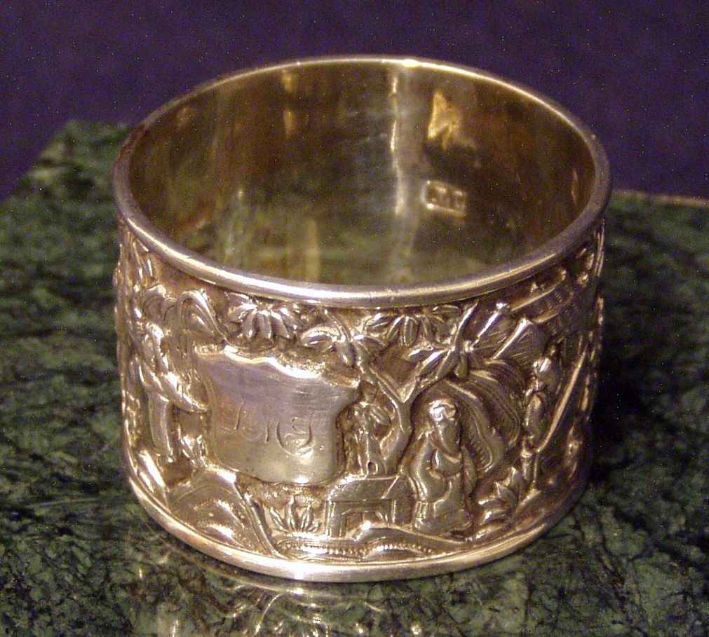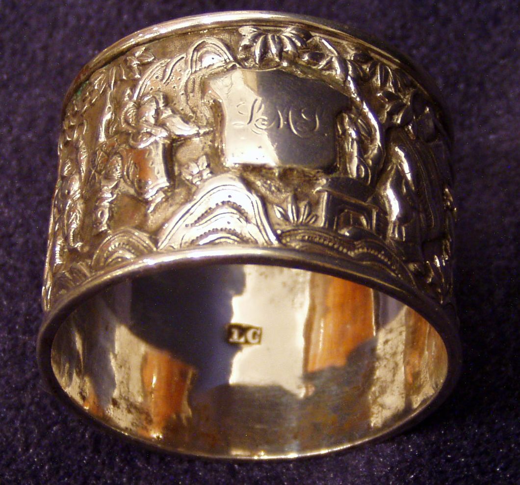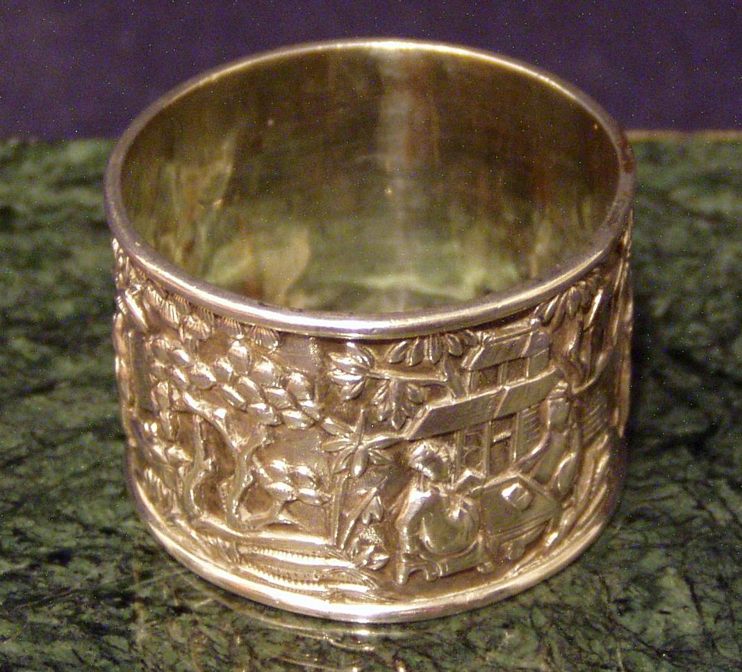 Chinese Export Silver 900F Napkin ring w/double skin of Mandarins in a Scholar’s garden