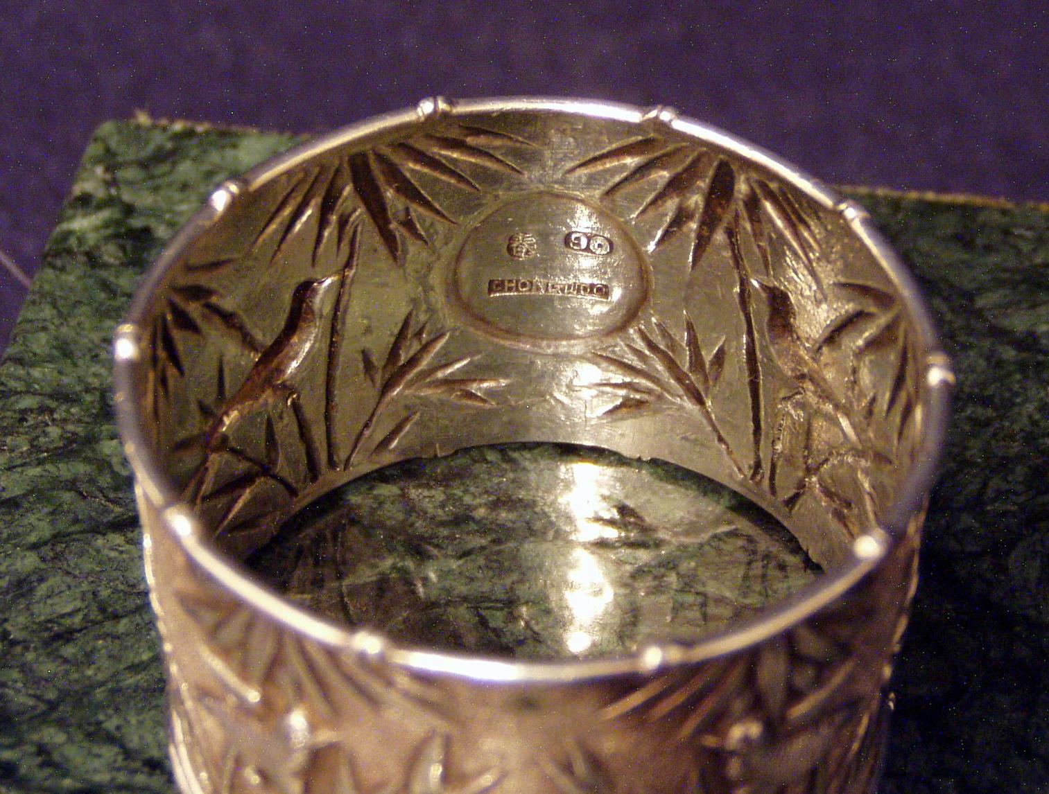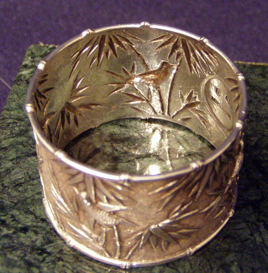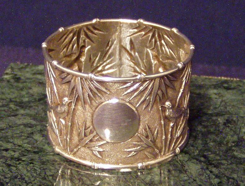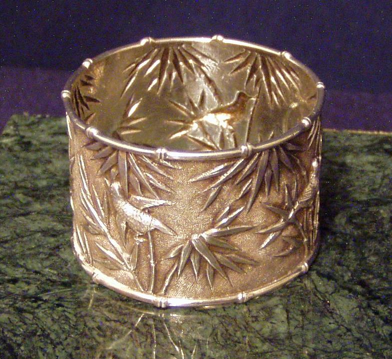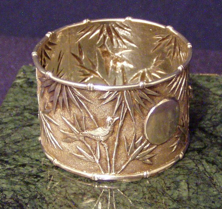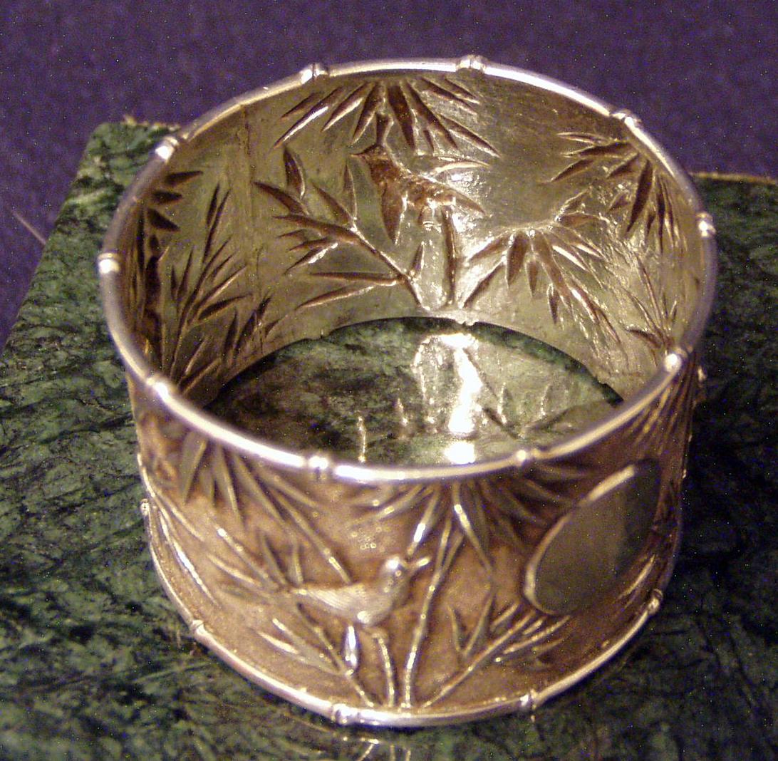 Chinese Export Silver 900F Napkin Ring w/chased decoration of Bamboo and birds & very fine
