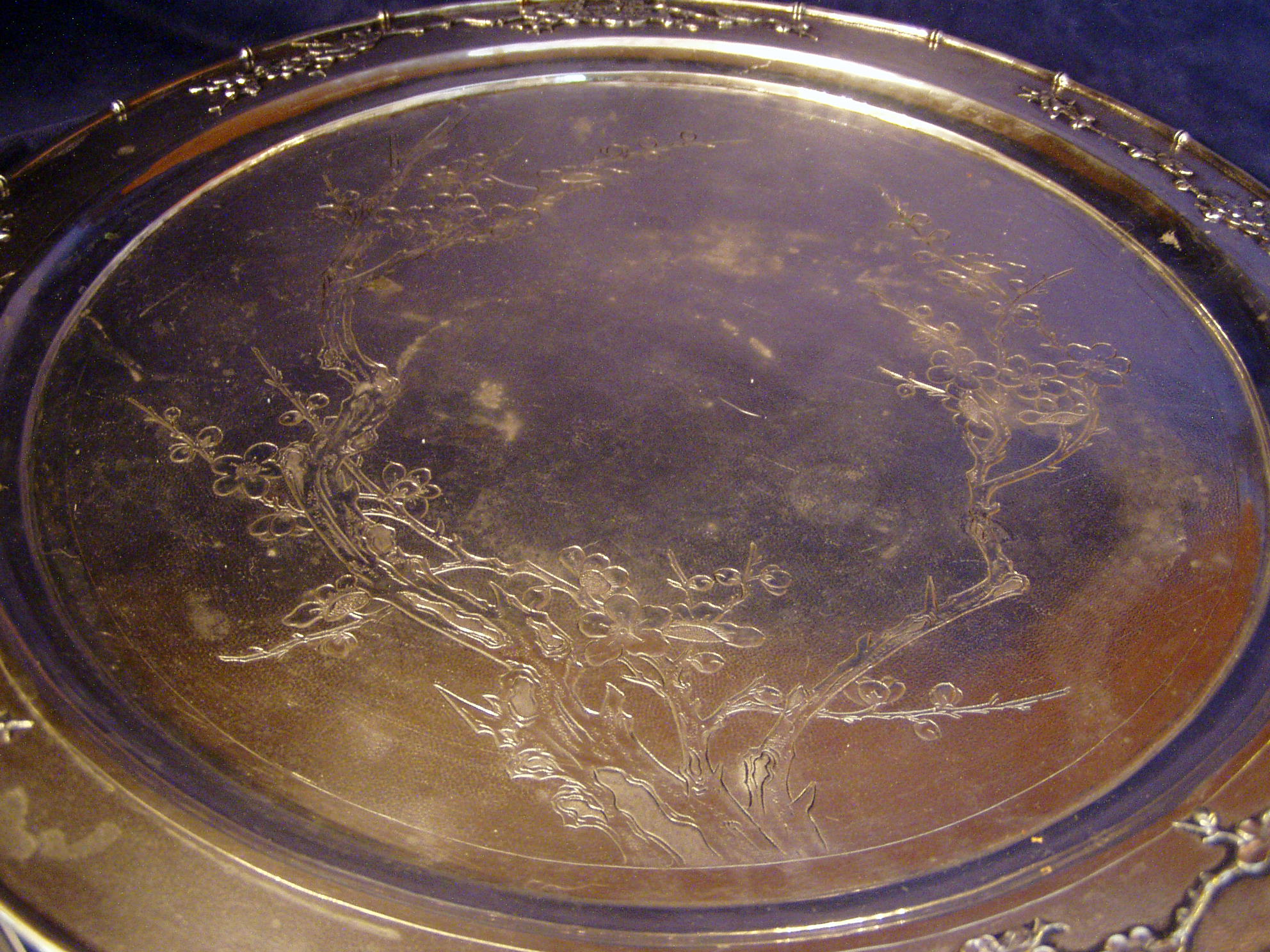 Round Chinese Export Silver, three button footed tray; prunus decoration w/noduled bamboo