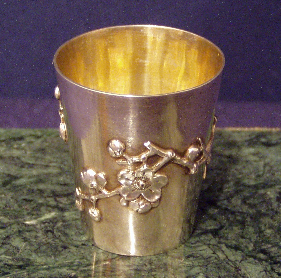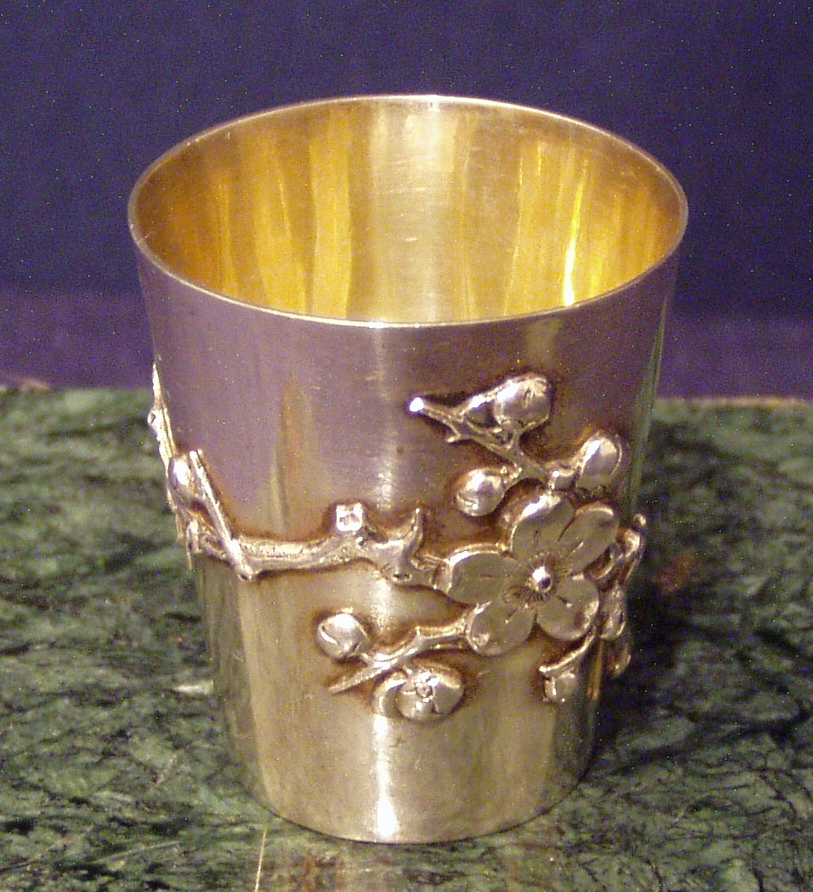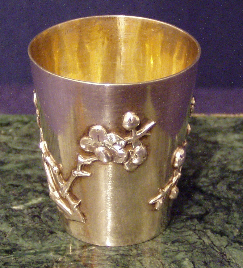 Chinese Export Silver 900F Jigger w/gilded interior and cast and applied prunus decoration on