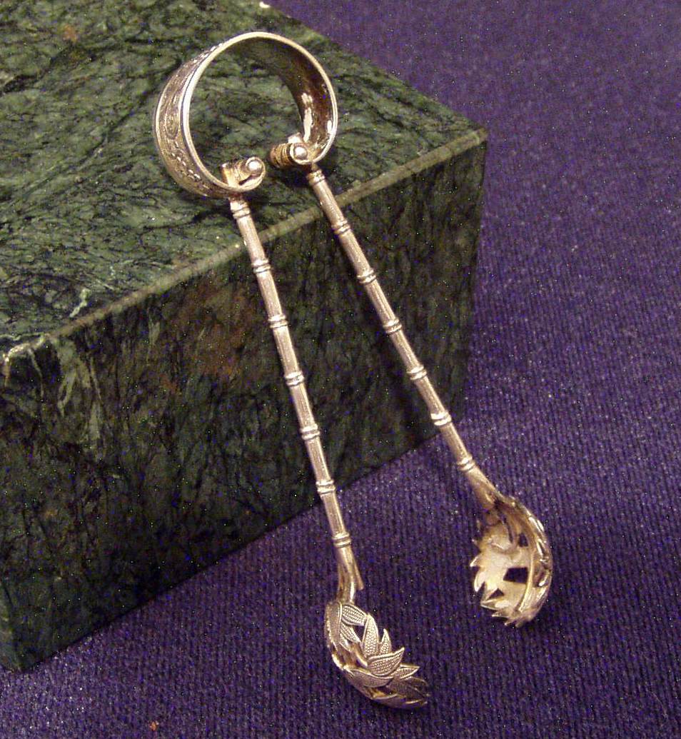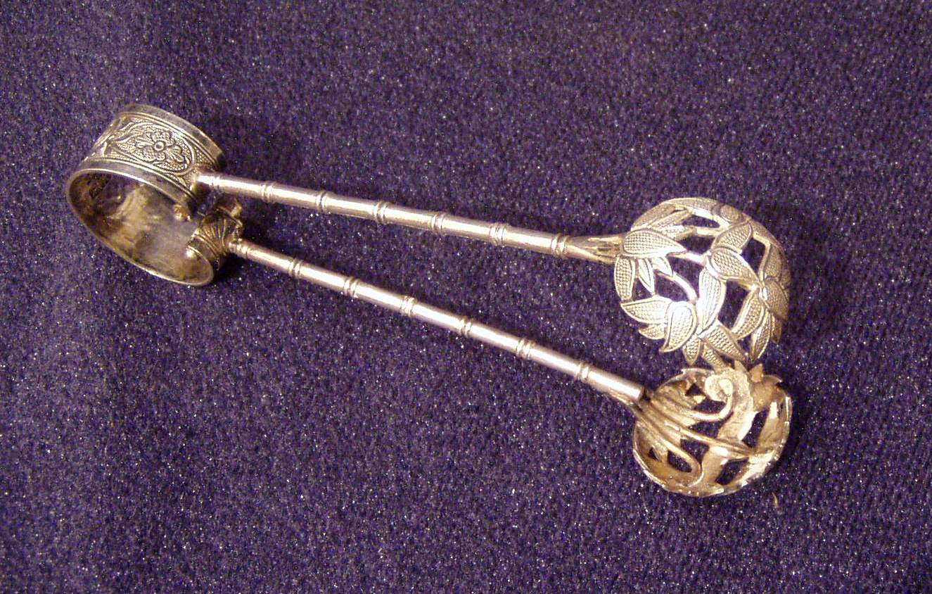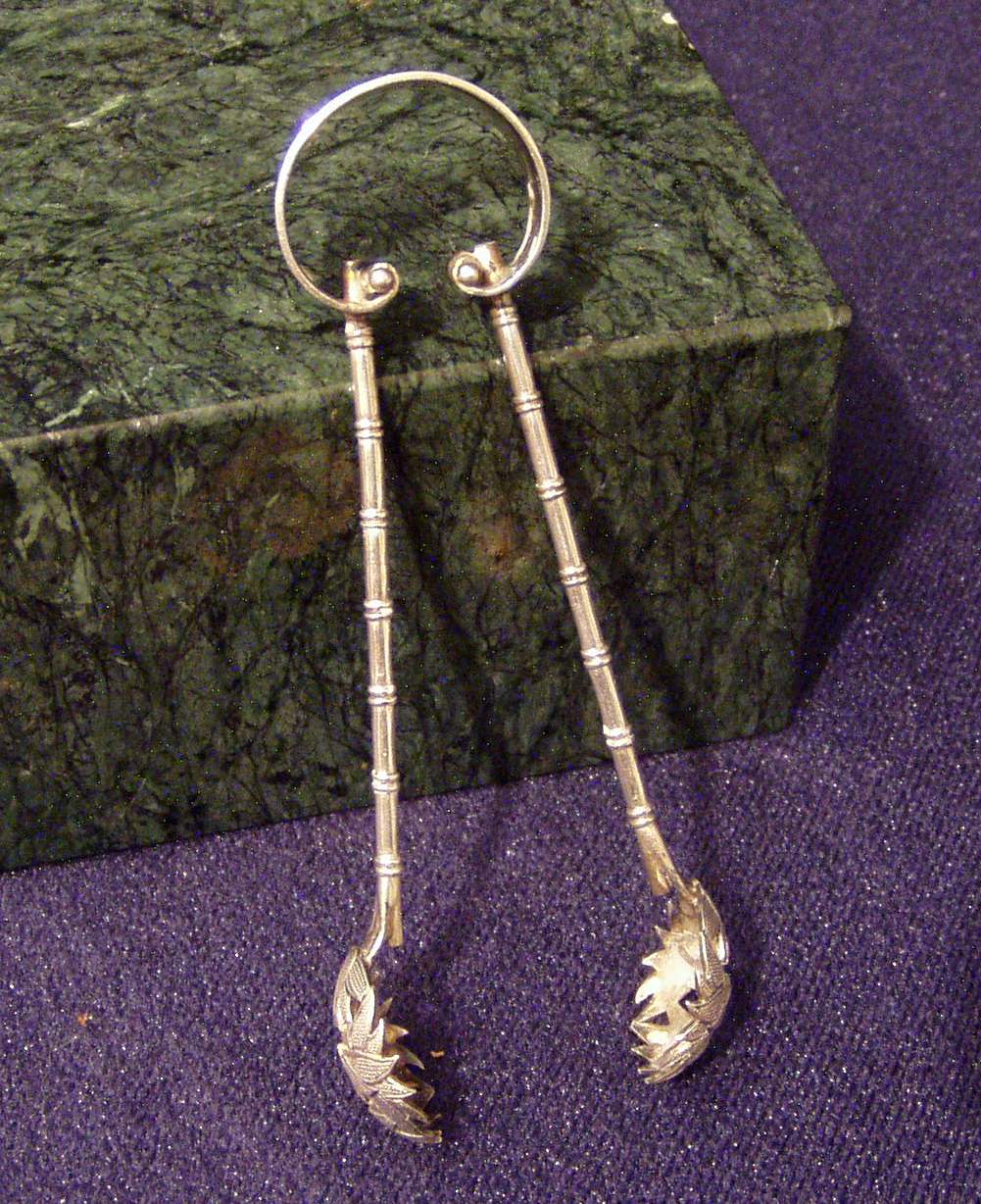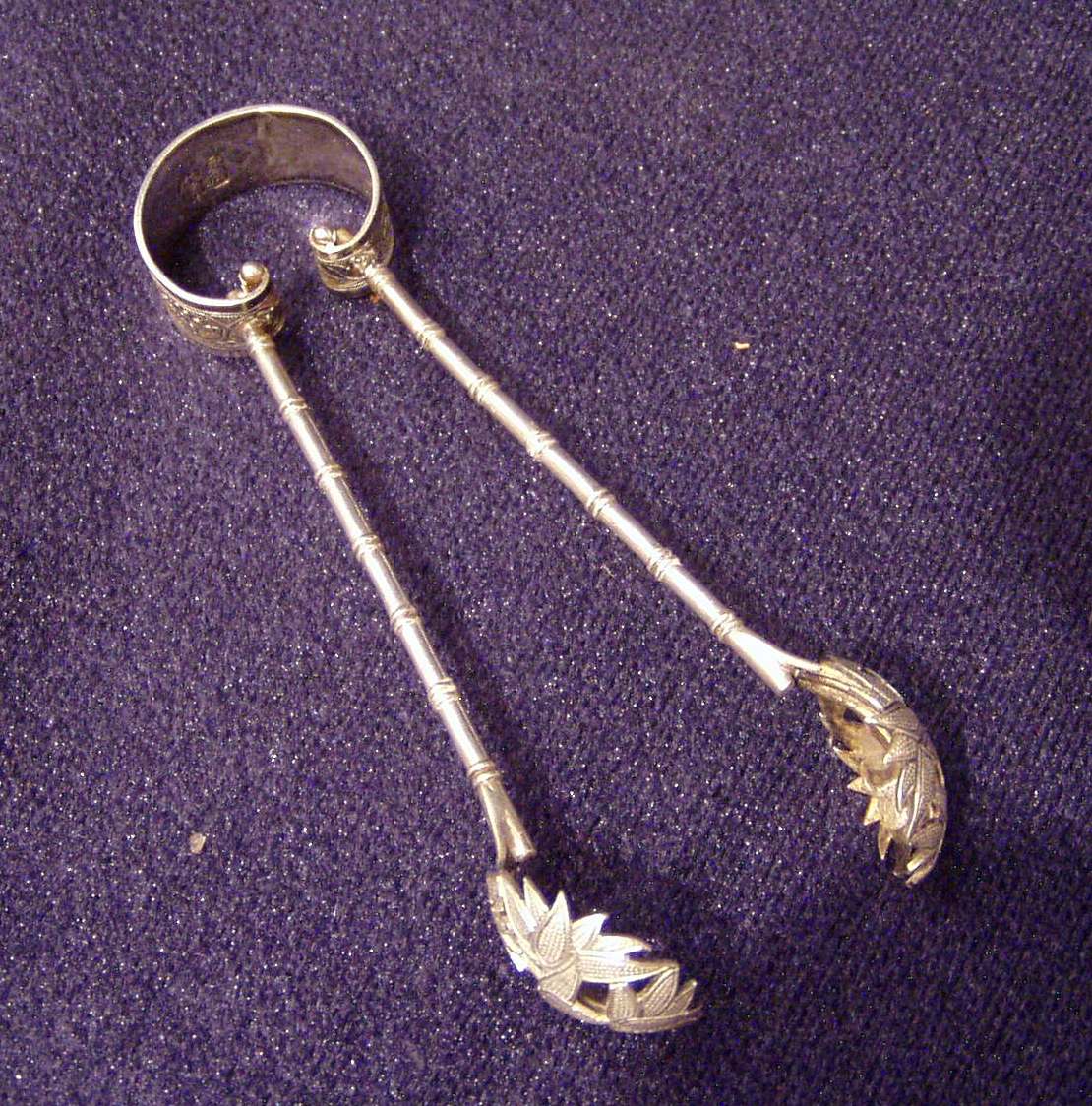 Pair Chinese Export Silver 900F Sugar Tongs w/bamboo culms as arms w/what appear to be