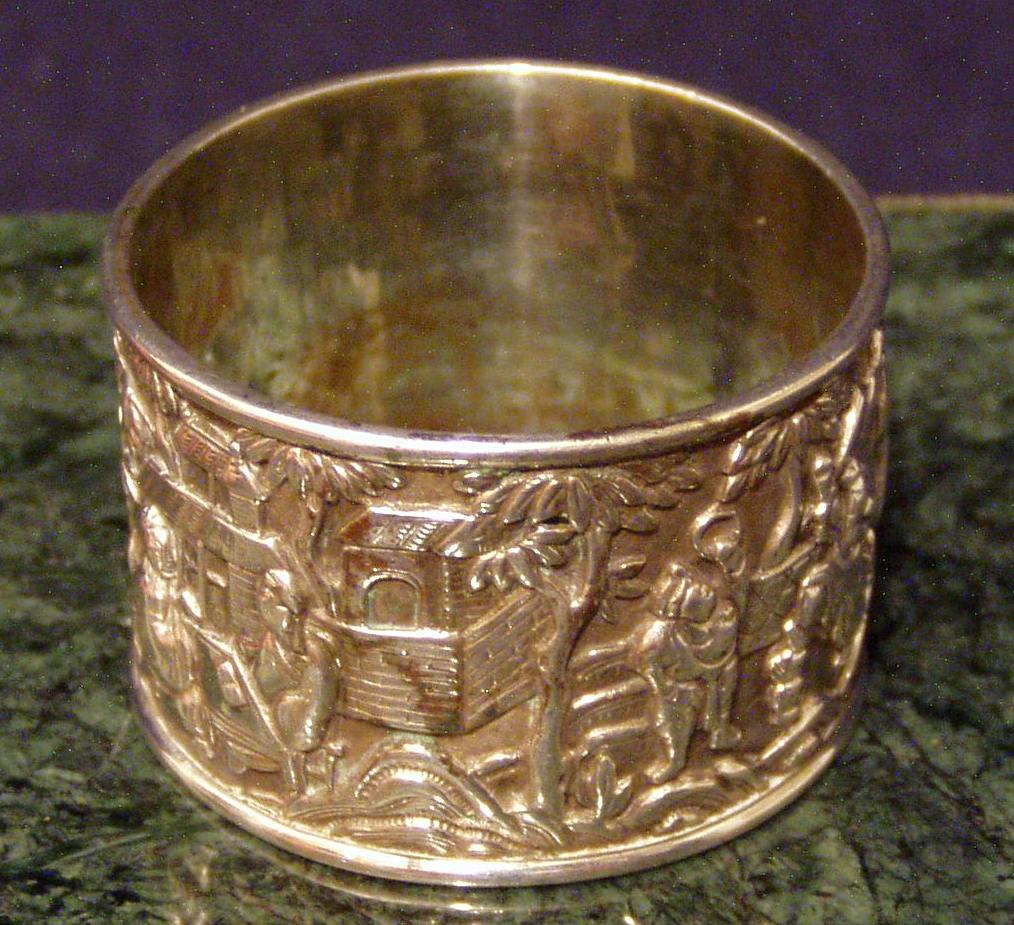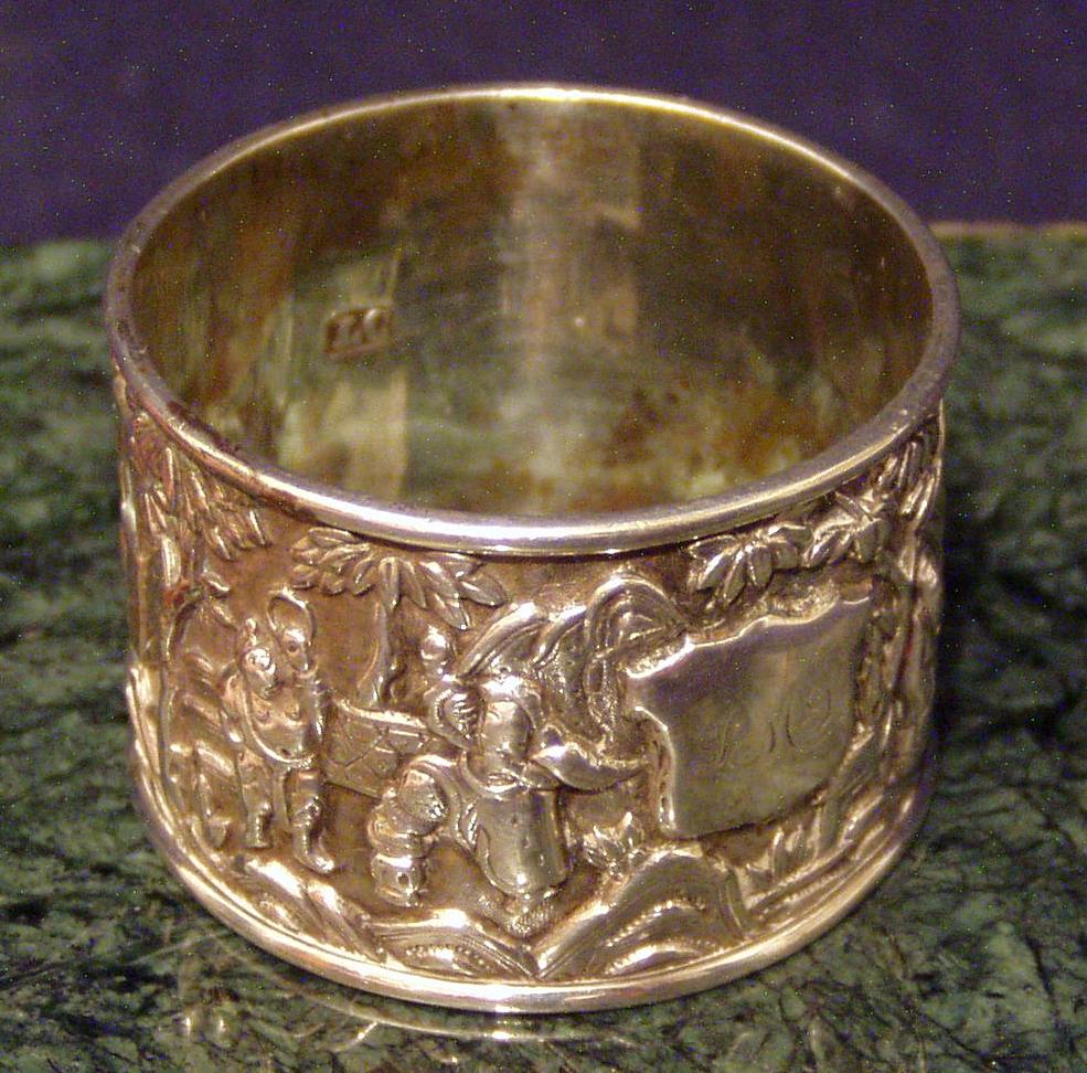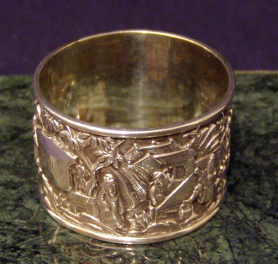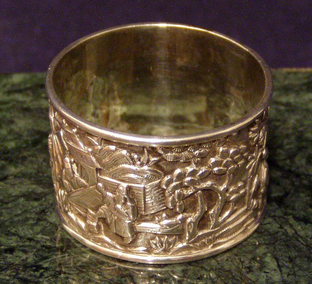 Chinese Export Silver 900F Napkin ring w/double skin of Mandarins in a Scholar’s garden